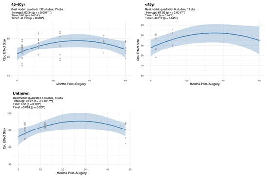 Footnote: All models were unadjusted and fitted independently within each surgery subgroup using quadratic or linear terms depending on fit. EF estimates are on a 0–100 scale. QM p-values refer to model significance. QE tests for unexplained variance. Significance codes: *** p < 0.001, * p < 0.05.