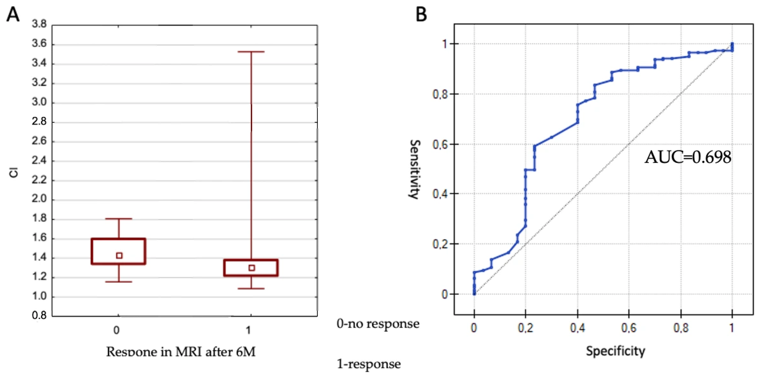 Given the statistical significance, a receiver operating characteristic (ROC) curve was constructed to determine the optimal CI cut-off value differentiating between response and non-response. The area under the curve (AUC) was 0.698, which differed significantly from 0.5 (p = 0.00069). The proposed cut-off value was 1.42, corresponding to a sensitivity of 83.5% and a specificity of 53.3%. In summary, better treatment responses were observed in lesions with a CI < 1.42.
