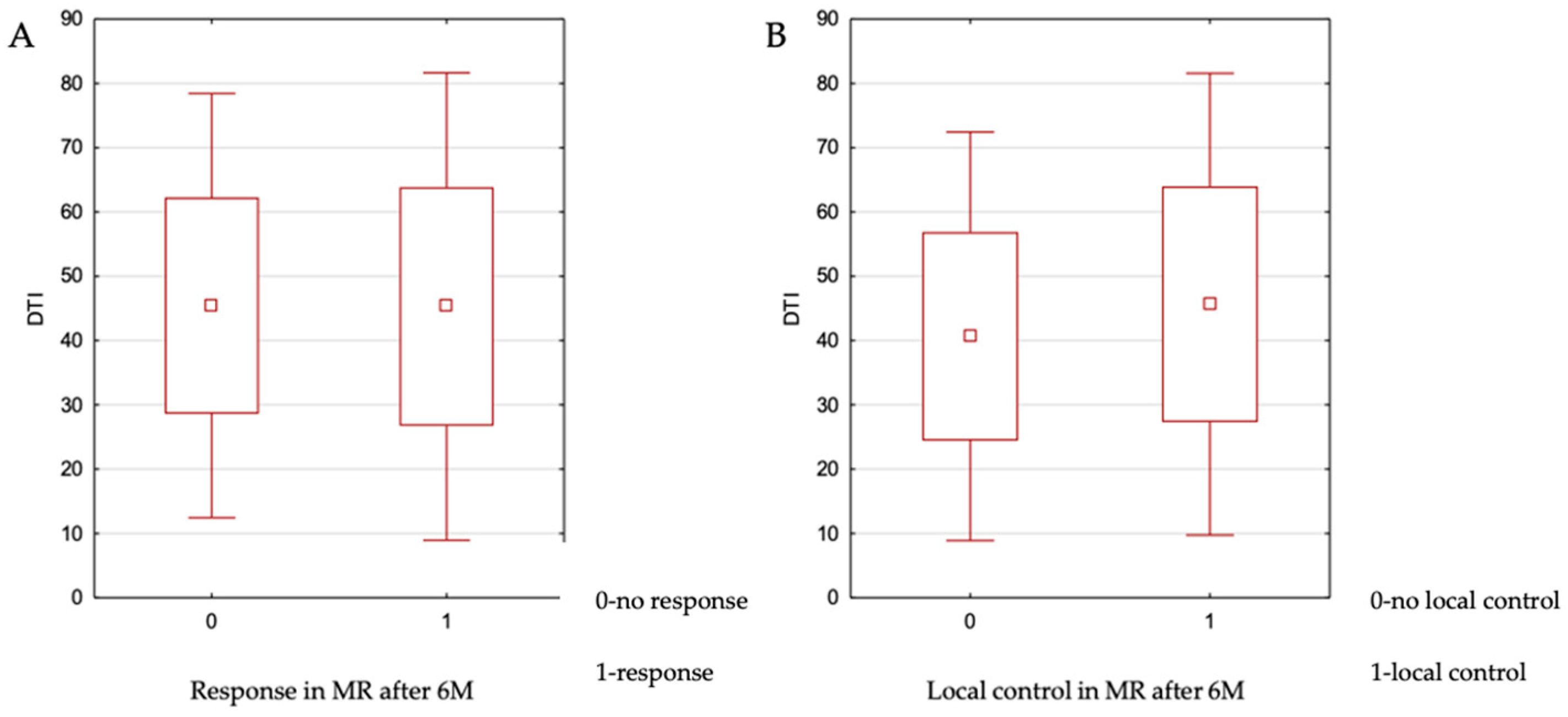 The DTI parameter for the analyzed metastatic lesions ranged from 7 to 85 mm, with a median value of 45 mm. The impact of DTI on local control at 6 months was assessed using the independent samples