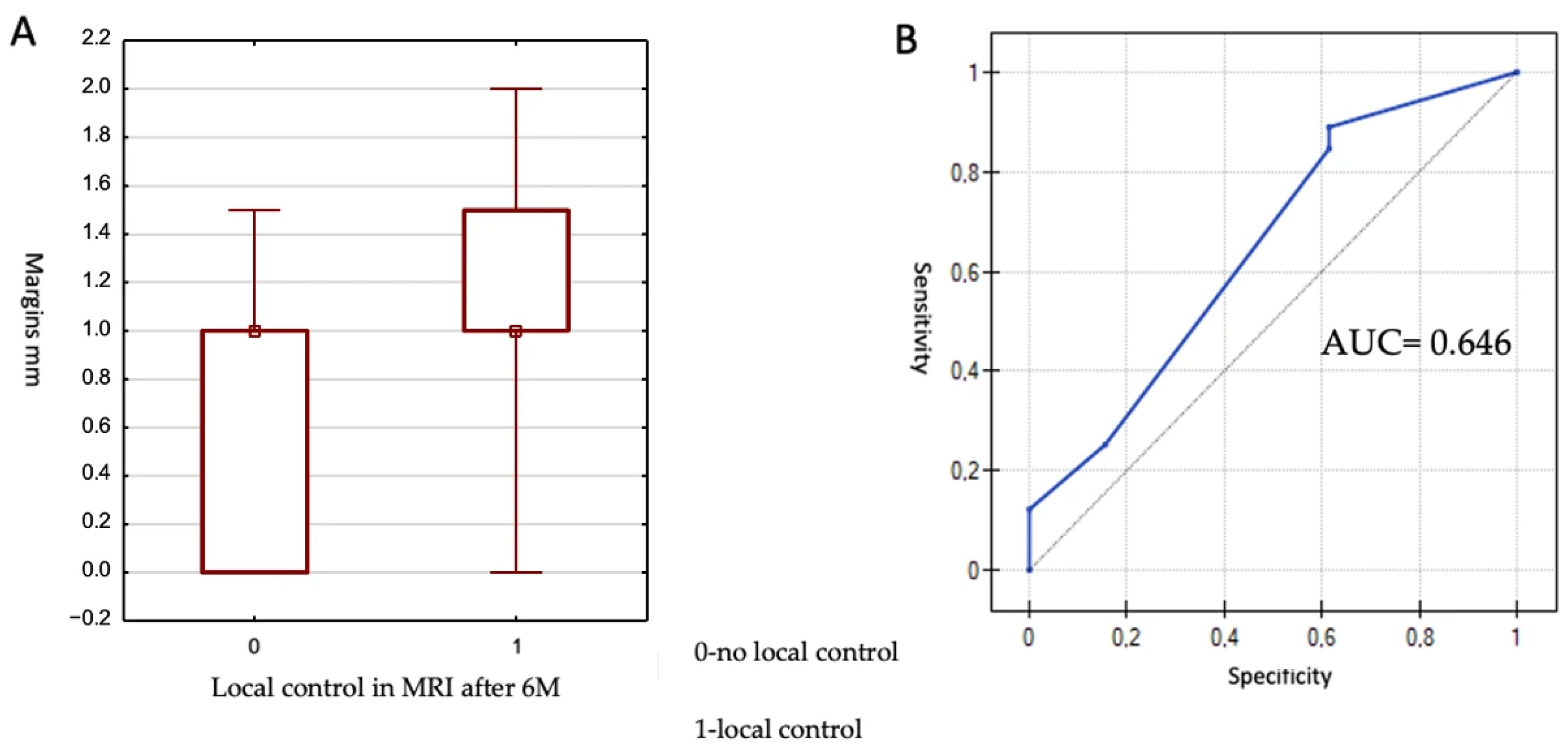 The smallest margin was 0 mm, and the largest was 2 mm, with a median of 1 mm. The Mann–Whitney U test was used for statistical analysis. A statistically significant impact of margin size on lesion control at 6 months was demonstrated (