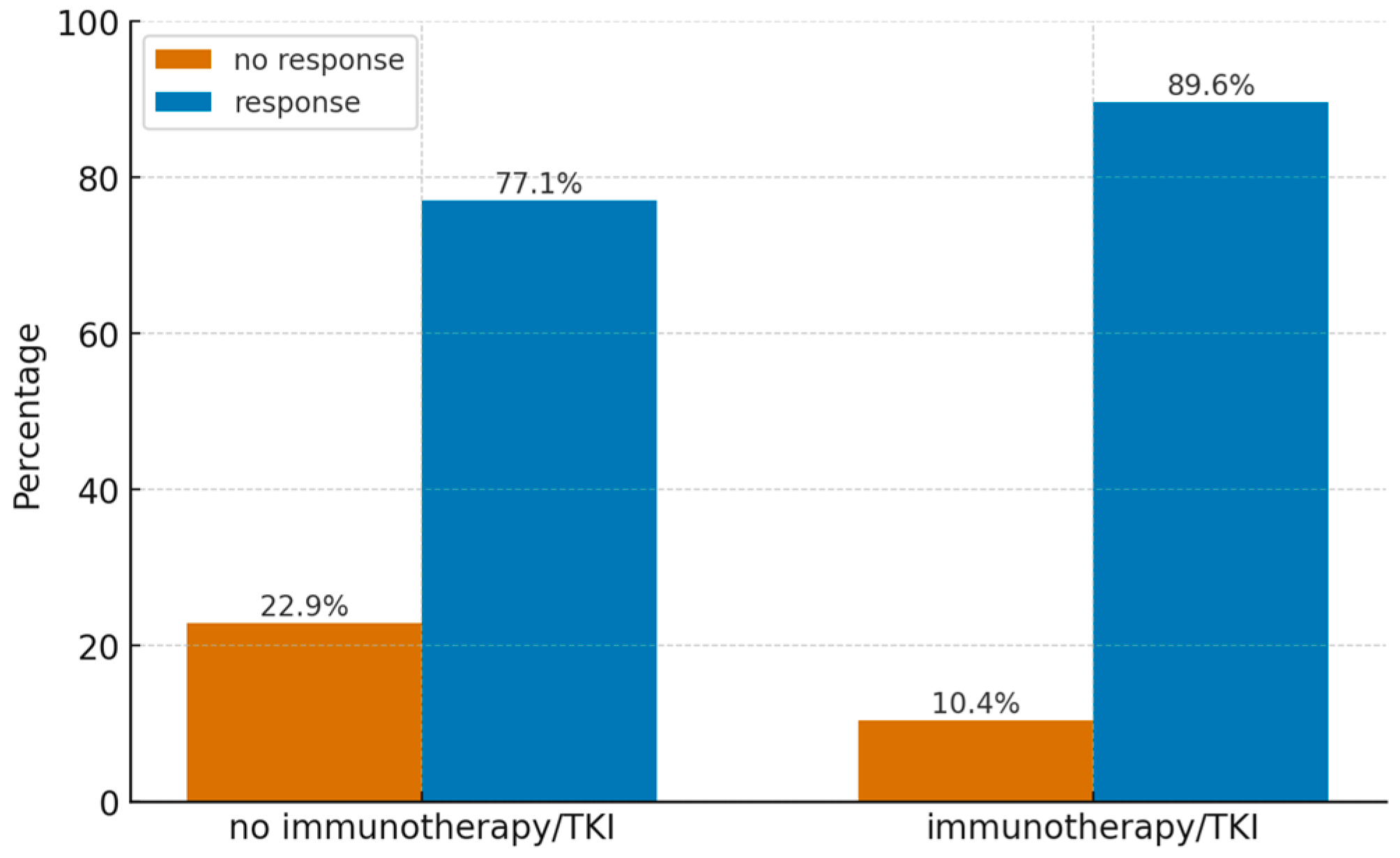 An asymptotic odds ratio was calculated, yielding a statistically significant value of p = 0.030 for an odds ratio of 2.55 (95%CI 1.10; 5.98) indicating that patients who received immunotherapy or targeted therapy had a 2.55-fold greater likelihood of achieving a response compared to those who did not.