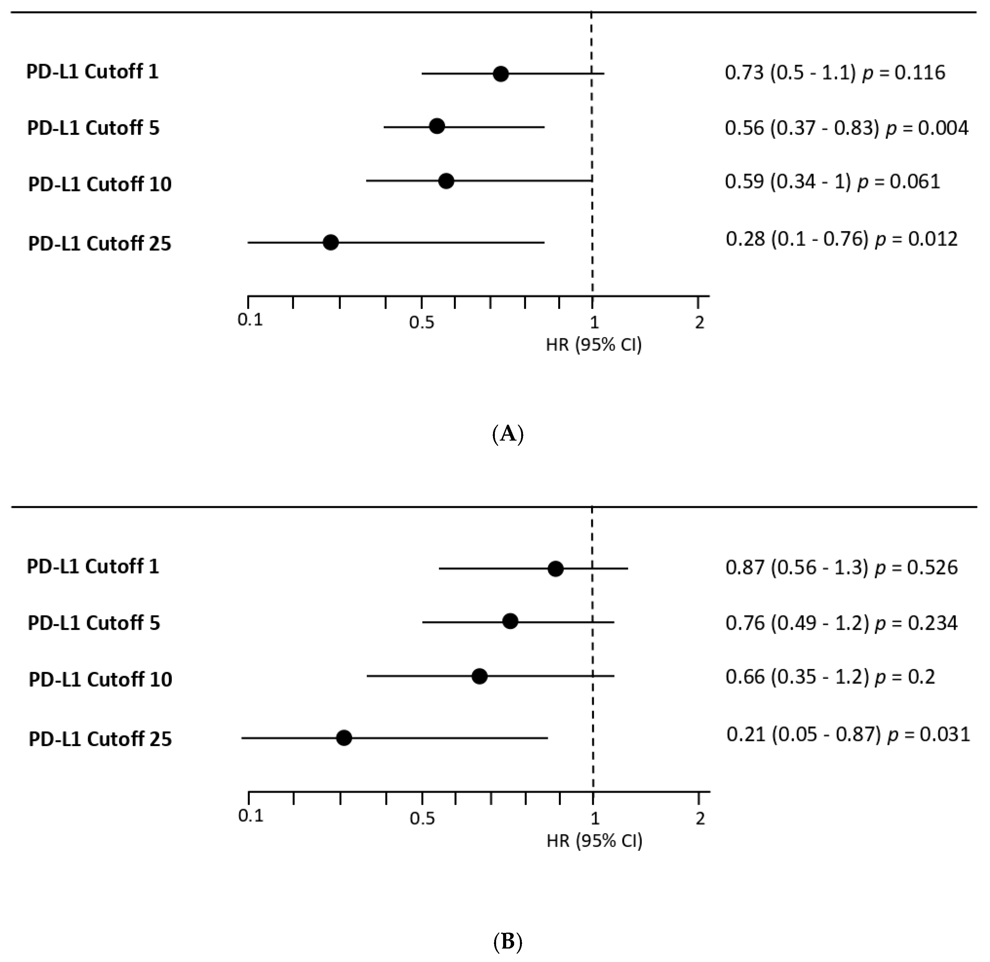 3.2. Survival Outcomes According to PD-L1 Expression Status