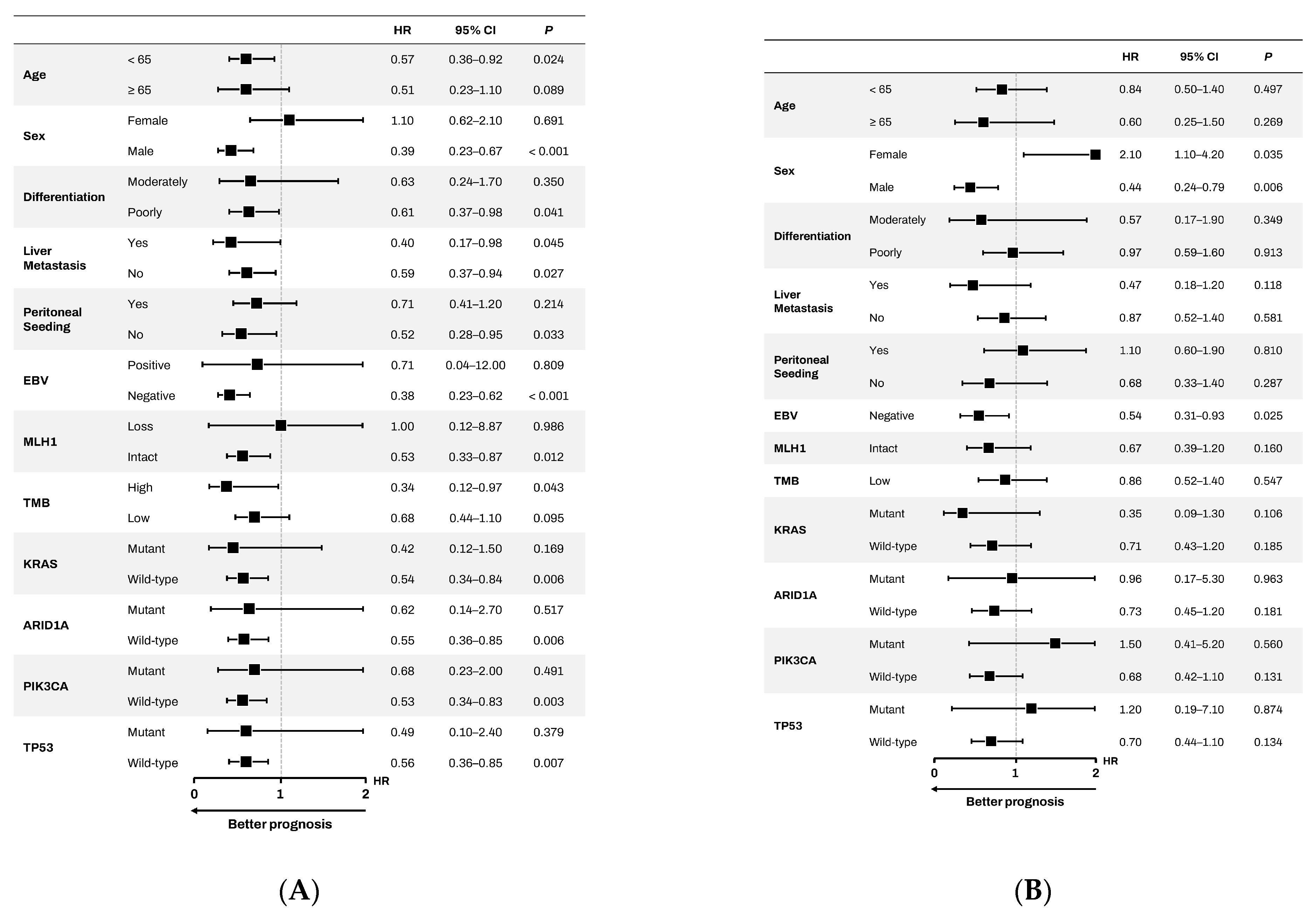 - Ke, L.; Li, S.; Huang, D. The predictive value of tumor mutation burden on survival of gastric cancer patients treated with immune checkpoint inhibitors: A systematic review and meta-analysis. Int. Immunopharmacol. 2023, 124, 110986. [Google Scholar] [CrossRef] [PubMed]