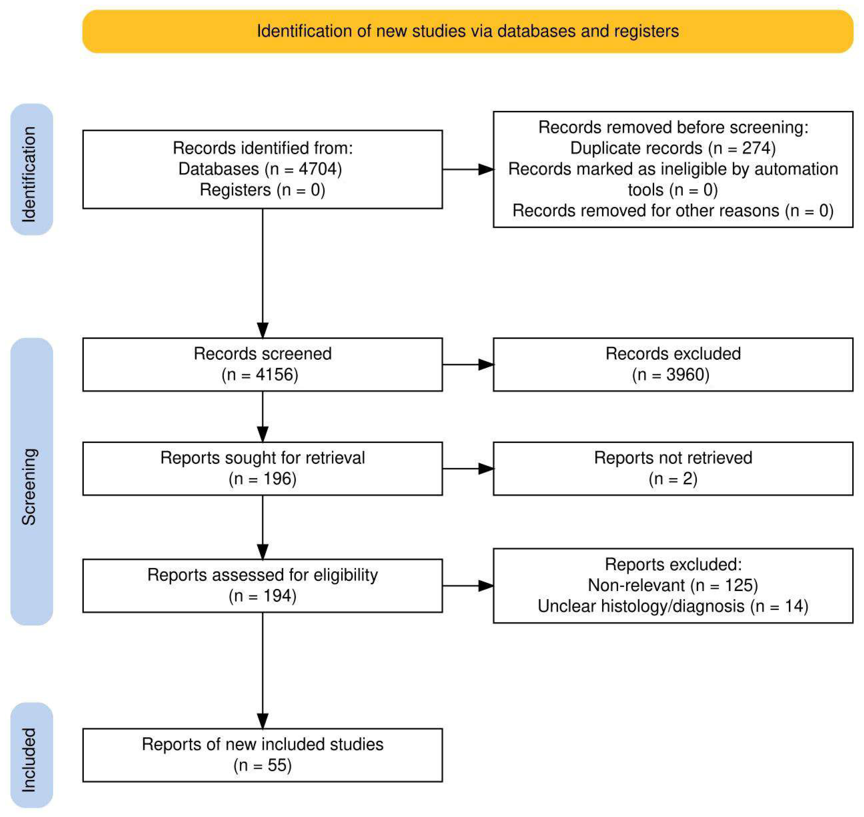 | Dash et al., 2024 [37] | Hemangiopericytoma (probably to be recategorized as Solitary fibrous tumor) | Densely packed spindle cells with a prominent vascular pattern with tumor cells showing irregular shaped nuclei, small nucleoli, and ill-defined cytoplasmic borders. | Not used (STAT6 not assessed) |