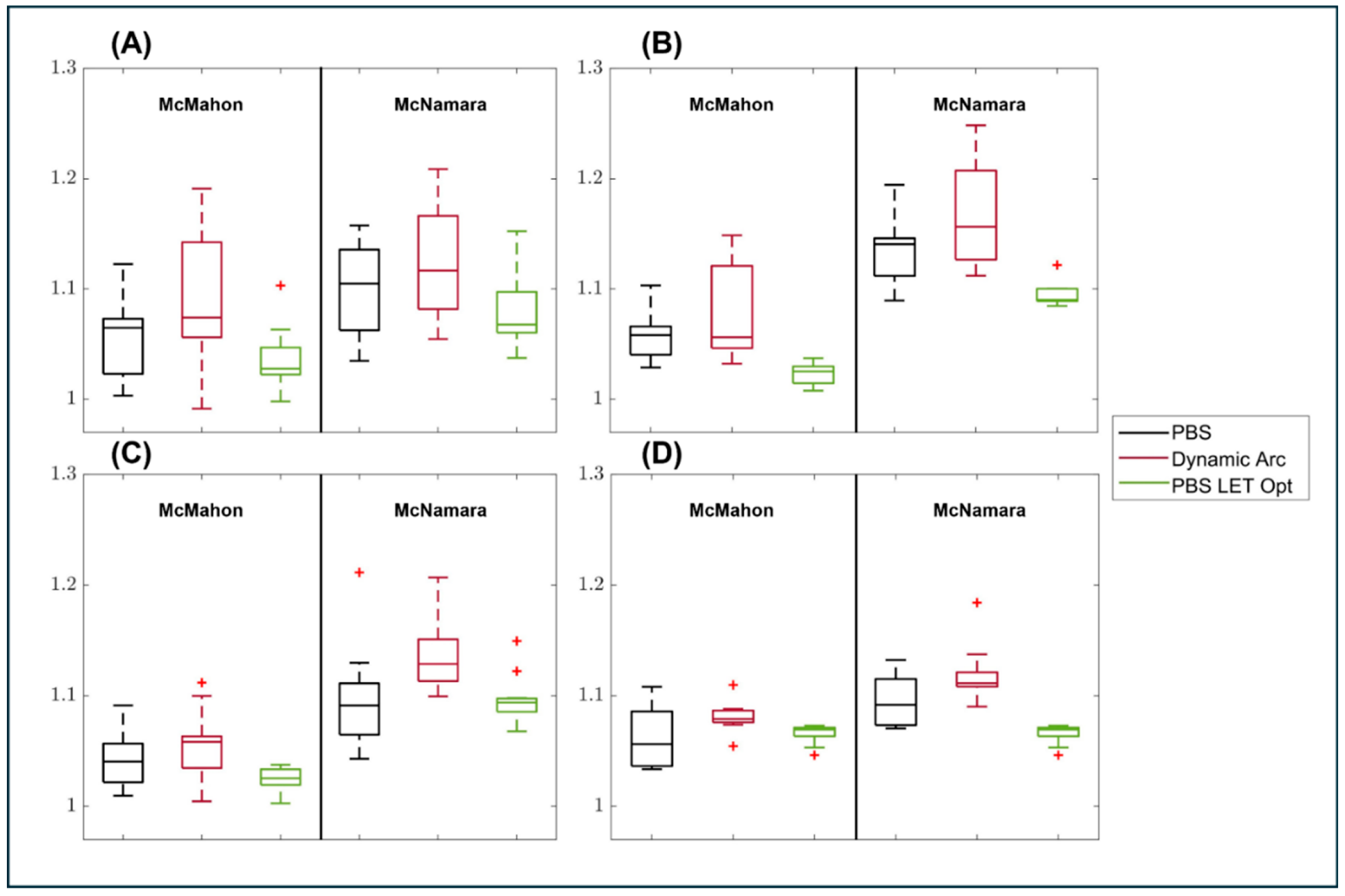 - Vieceli, M.; Park, J.; Hsi, W.C.; Saki, M.; Mendenhall, N.P.; Johnson, P.; Artz, M. Potential Therapeutic Improvements in Prostate Cancer Treatment Using Pencil Beam Scanning Proton Therapy with LETd Optimization and Disease-Specific RBE Models. Cancers 2024, 16, 780. [Google Scholar] [CrossRef]