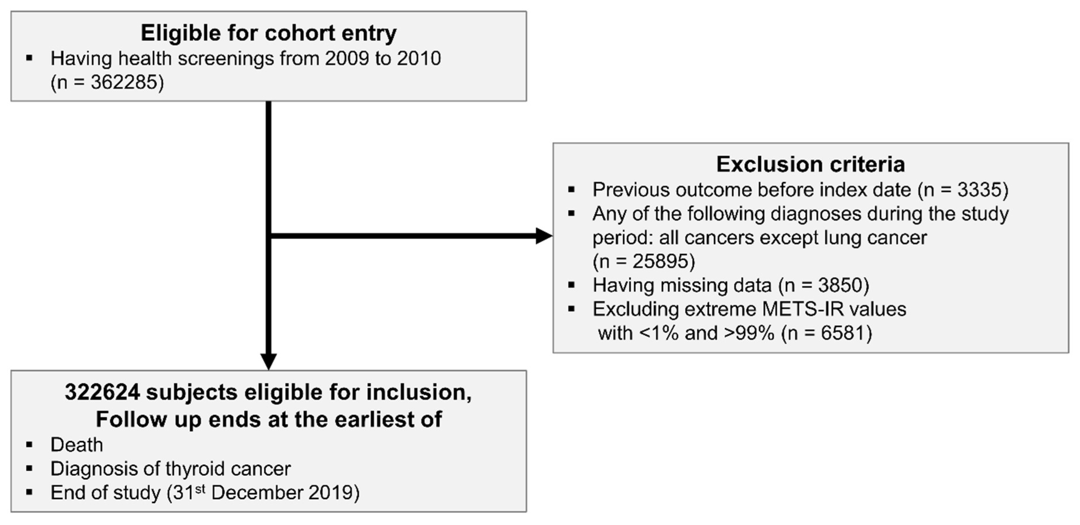 Participants (n = 364,757) who underwent a health screening program between 2010 and 2011 were initially identified. The participants were diagnosed and categorized using the International Classification of Diseases, version 10 (ICD-10). To refine the cohort, we excluded individuals with a previous diagnosis of lung cancer (n = 3335), those diagnosed with cancers other than lung cancer during the observation period (n = 25,895), and those with missing data (n = 3850). Participants with missing values for fasting glucose, triglyceride, HDL-cholesterol, or covariates were excluded from the analysis (complete-case analysis). No imputation was performed. We excluded 6581 participants with METS-IR values below the 1st percentile or above the 99th percentile. The final cohort comprised 322,624 participants. The follow-up period continued until 31 December 2019, or until death or a diagnosis of lung cancer was made (Figure 1).