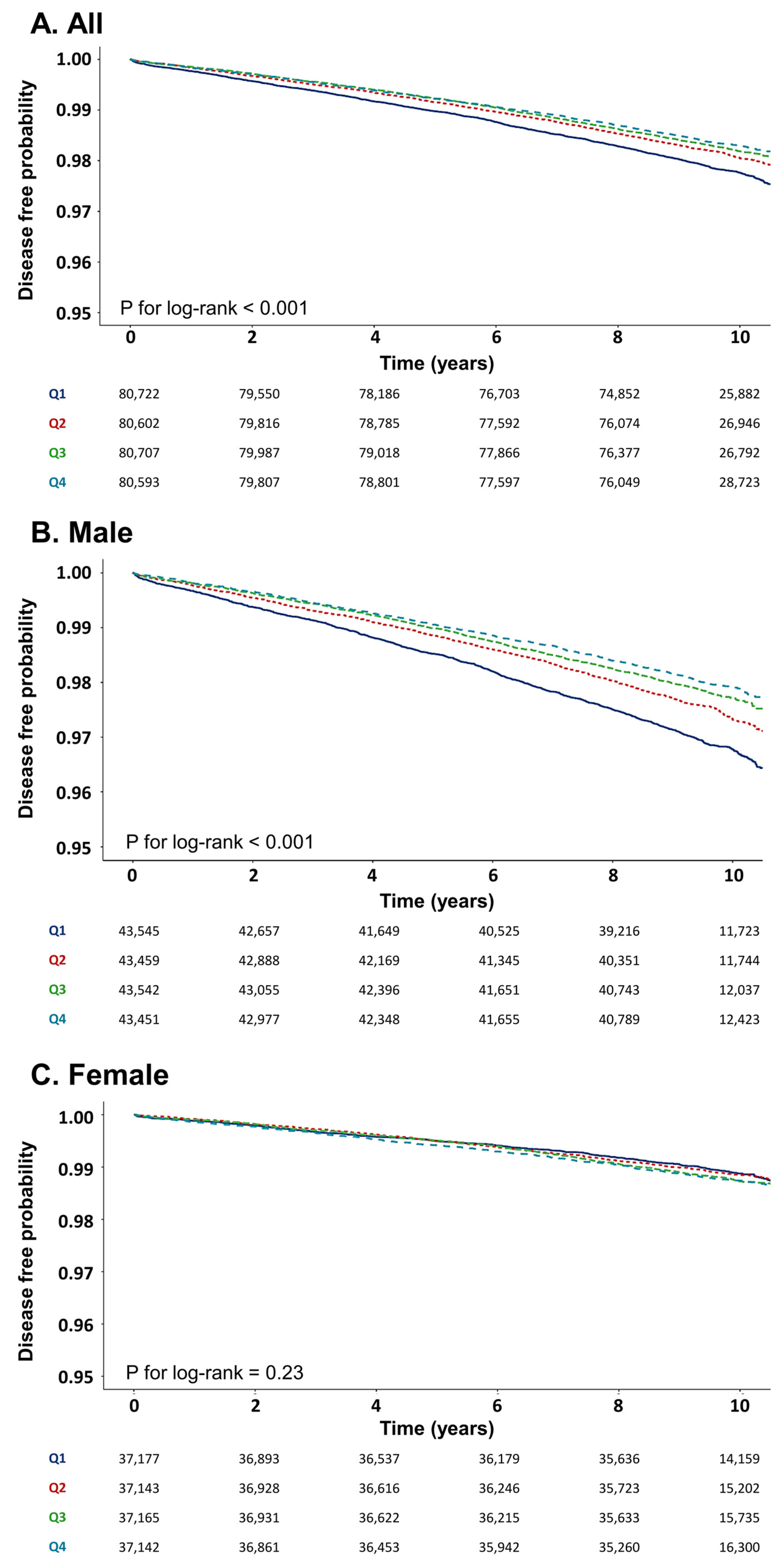 METS-IR was calculated using the following formula: ln [(2 × fasting blood glucose (FBG) in mg/dL + serum TG level in mg/dL) × BMI in kg/m2]/ln [HDL-C level in mg/dL] [15]. At baseline, 322,624 participants were divided into four quartiles (Q1, Q2, Q3, and Q4) based on their METS-IR results, and the outcome variables were identified during follow-up.