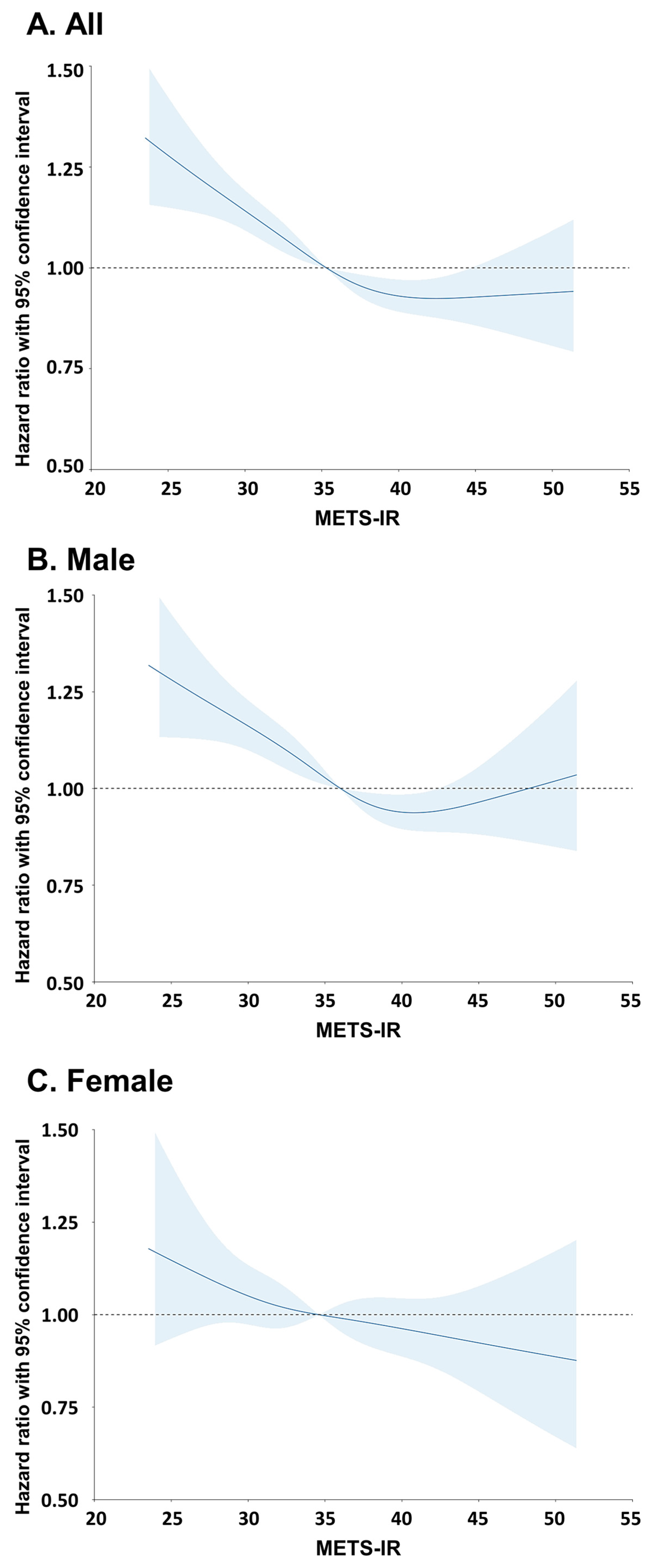 Figure 3 shows a restricted cubic spline for the correlation between METS-IR and lung cancer incidence. The nonlinear relationship between METS-IR and the incidence of lung cancer was evaluated by a restricted cubic spline using a multivariable adjusted model to depict the trend of HR with respect to METS-IR. The restricted cubic spline curves showed that the incidence of lung cancer decreased with increasing METS-IR for all participants.