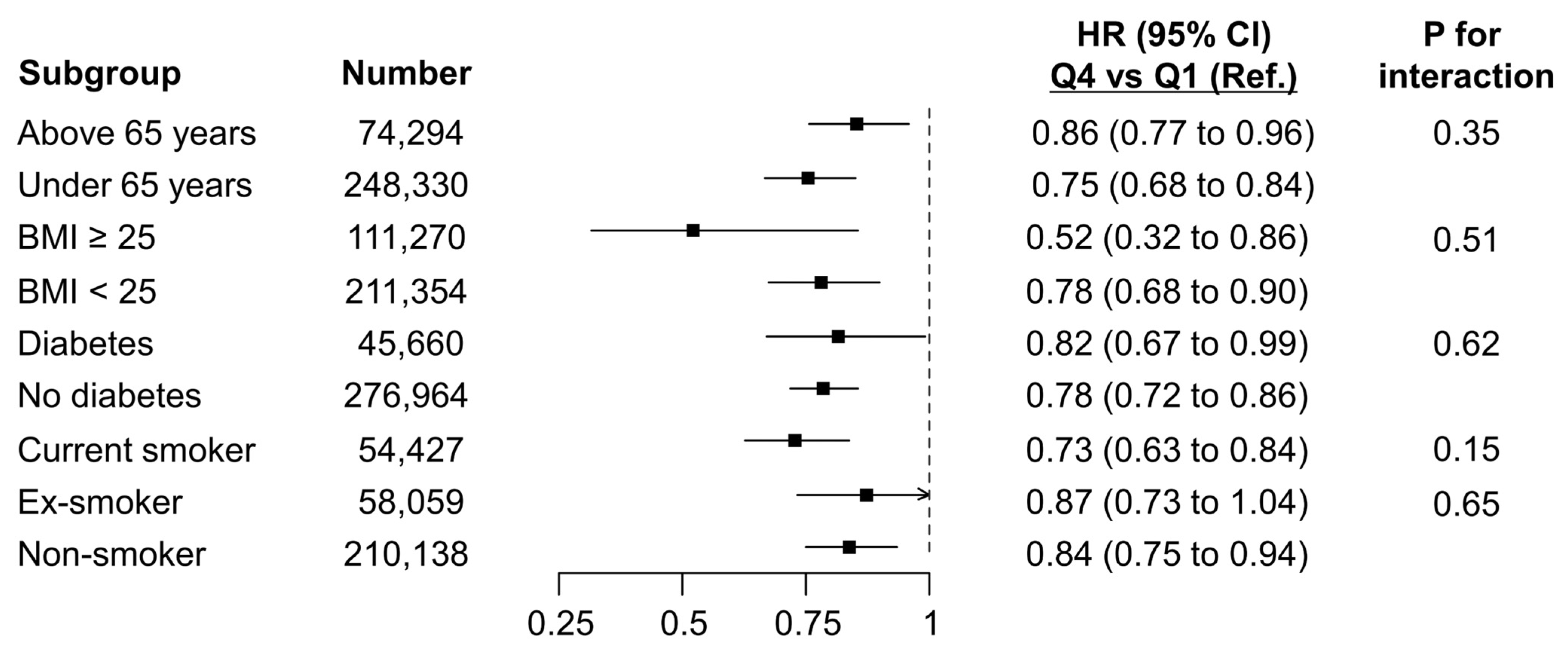 Figure 4 shows HR comparisons from Q4 to Q1 of the METS-IR within subgroups categorized by age (<65 years and ≥65 years), obesity (defined as BMI ≥ 25), diabetes, and smoking status (current smoker, ex-smoker, and non-smoker). According to the subgroup analysis, all examined subgroups showed a decrease in HR at Q4 compared to that at Q1 of the METS-IR, consistent with the overall population. Notably, this decrease was most pronounced in the obesity subgroup.