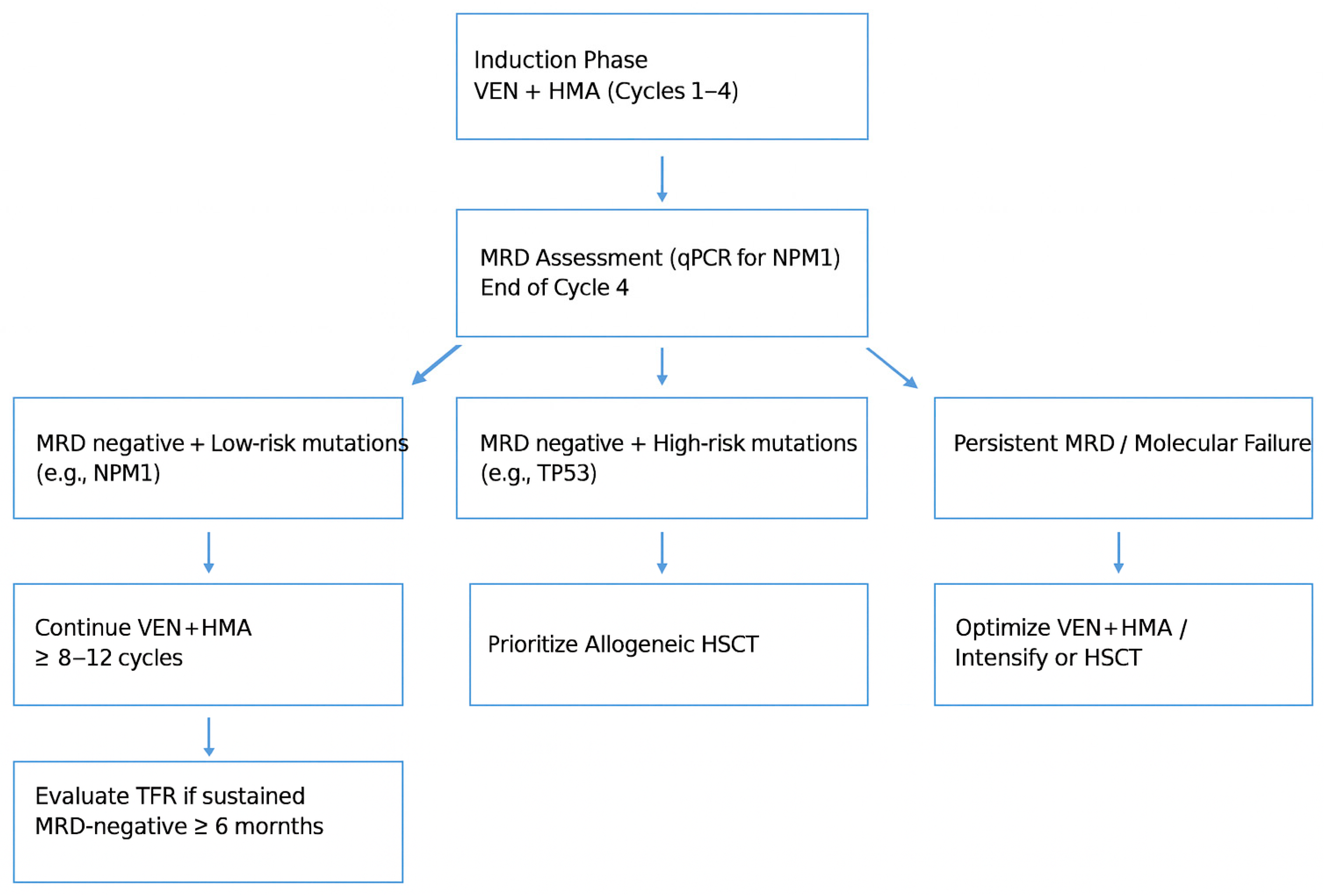 | Active Observation | MRD-negative patients without additional genetic risks | Avoids treatment toxicity; maintains good quality of life | Risk of relapse if MRD monitoring is inadequate | Retrospective study by Chua et al. [7], prospective study by DiNardo et al. [14] |