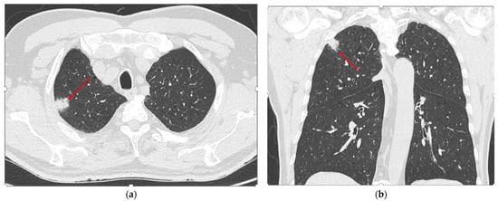 Interstitial abnormalities suggestive of early interstitial lung disease (ILD) and airway pathology were found in 23 patients (13.9%) and 13 patients (7.8%), respectively, without significant differences between smokers and non-smokers. Nodules suspicious for LC (Lung-RADS score ≥ 3) were present in 11 patients (6.6%), each with a single lesion. Of these, 4 were current smokers, 4 were former smokers, and 3 were non-smokers. Although the prevalence of suspicious nodules was higher among patients with a history of smoking (72.7% vs. 27.3%, OR 3.32), the difference did not reach statistical significance. Histological data, obtained either via bronchoscopic biopsy or surgical excision, were available for five of these eleven patients (45%). Importantly, all nodules were confirmed as primary lung cancers (three adenocarcinomas and two squamous cell carcinomas), excluding metastatic bladder carcinoma. A representative example of a suspicious pulmonary nodule (Lung-RADS score = 4B) detected in one of the patients is shown in Figure 3.