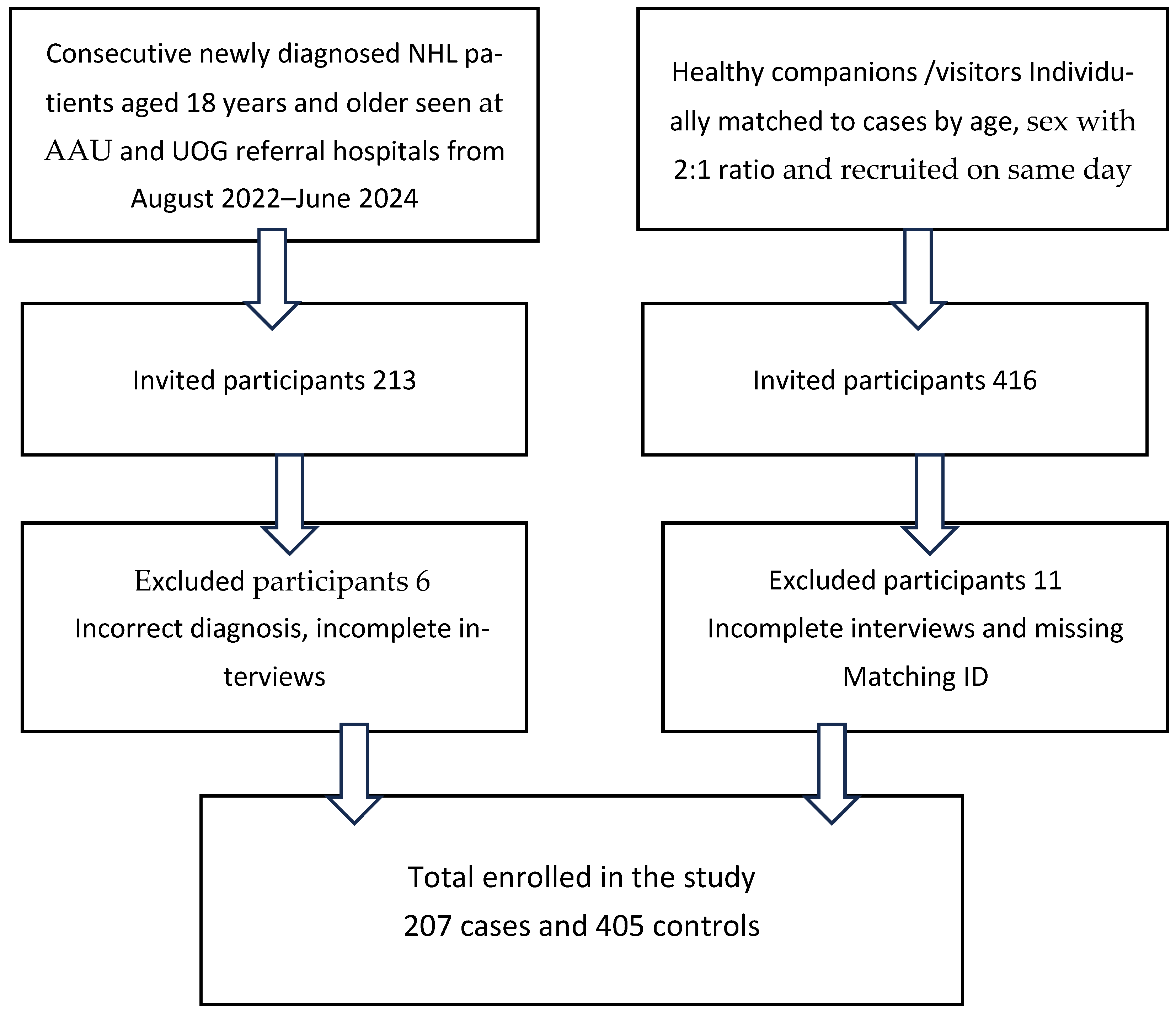 - Chekol, D.; Bedimo, M.; Mulugeta, Y.; Bantie, G.M. Determinants of non-Hodgkin’s lymphoma at Felegehiwot Specialized Hospital, North West Ethiopia: A case-control study. PLoS ONE 2021, 15, e0243561. [Google Scholar] [CrossRef]