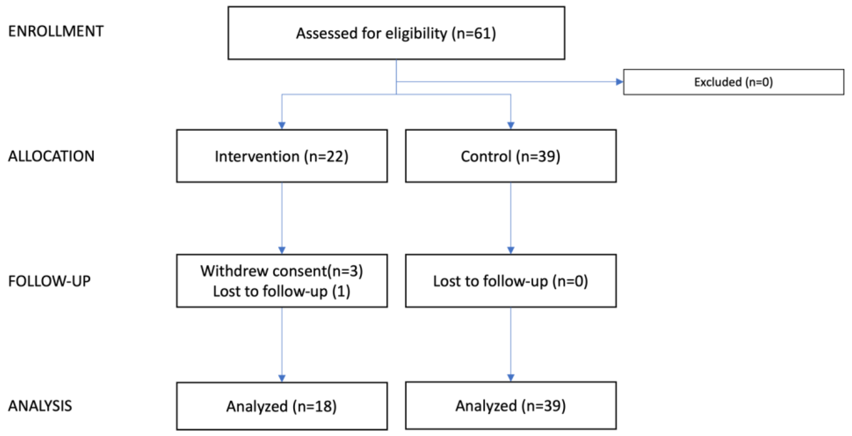 Sixty-one patients were included in this study, 22 patients in the intervention group and 39 patients in the control group (Figure 1). Three patients withdrew from the intervention group, and one patient was lost to follow-up; one changed her mind regarding participation in the trial, one withdrew due to side effects (itching), and one withdrew because her breast cancer was too overwhelming, and she could not foresee participating in the trial. Thus, 18 of 22 patients were treated per protocol in the intervention group. None withdrew from the control; thus 39 patients were eligible for final analysis.