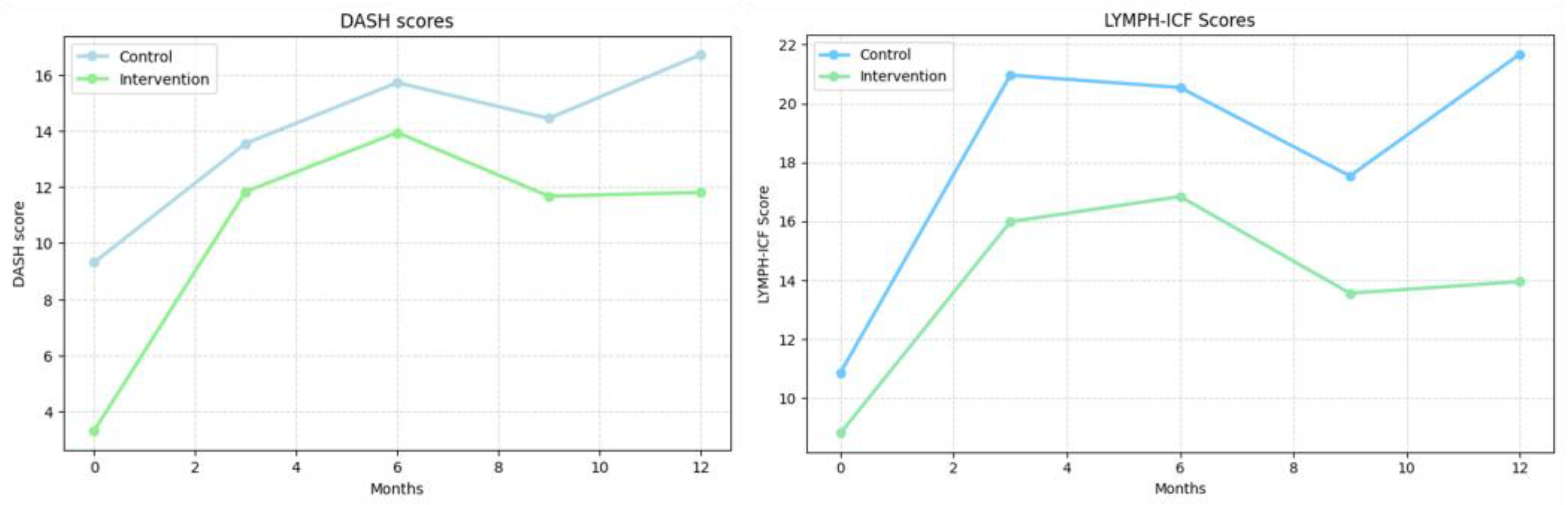 Participants completed the questionnaires in the outpatient clinic at baseline and at the 3-, 6-, 9-, and 12-month follow-ups. Raw scores from all questionnaires were transformed into standardized scores ranging from 0 to 100, according to each instrument’s scoring manual. For the LYMPH-ICF and DASH questionnaires, higher scores indicated greater symptom burden and functional limitation. For the EORTC QLQ-BR23, higher scores on functional subscales reflected better functioning, while higher scores on symptom subscales indicated more severe symptoms.