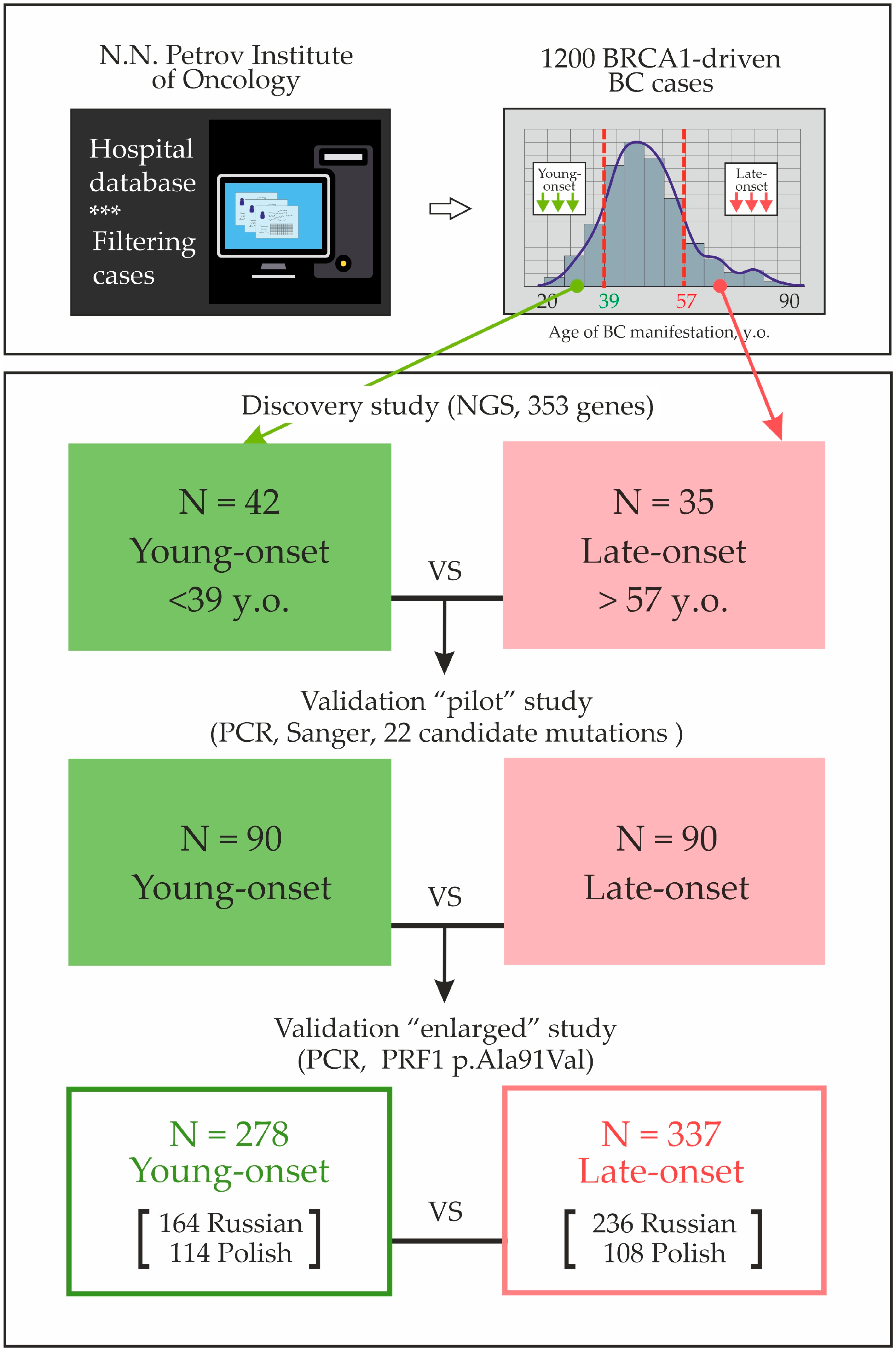 We initially considered all patients with BRCA1-driven BC treated in the N.N. Petrov Institute of Oncology (St. Petersburg, Russia). The study was approved by the Local Ethics Committee (approval date: 22 October 2021; reference No. 36/302). To define the borderline values for the “young-onset” versus “late-onset” groups, we evaluated the age distribution of cancer manifestation in the hospital database, including the clinicopathological data on 1200 consecutive BRCA1 mutation carriers who were forwarded to the local diagnostic facility between years 2008 and 2022 for genetic testing. The age cutoffs between the 1st and 4th quartiles were taken as thresholds, being <39 years for young onset and >57 years for late-onset. NGS for immune response genes was initially performed for 42 young-onset versus 35 late-onset BRCA1-mutated BC patients (the “discovery” cohort, Table 1; clinicopathological characteristics and the spectrum of BRCA1 pathogenic variants for these patients are presented in Supplementary Table S1). The study workflow is shown in Figure 1.