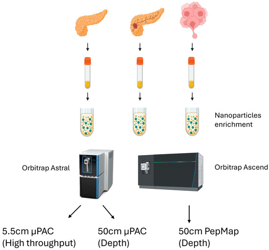We performed a small-scale pilot test using nanoparticle-based enrichment of plasma proteins from a total of 15 clinical samples. These samples consisted of four healthy controls, six pancreatic cancer patients with primary tumors, and five metastatic pancreatic cancer patients. Within the metastatic group, four had metastasized to the liver and one had metastasized to the peritoneal omentum (Table 1). An equal amount of ProteonanoTM (Nanomics Biotech, Zhejiang, China) magnetic nanoparticles were added to these plasma samples, and digested plasma samples were analyzed in a data-independent (DIA) workflow comprising two different Orbitrap mass spectrometers and three different analytical columns (Figure 1). On the Orbitrap Ascend, we used the standard DIA pipeline in the laboratory, focusing on depth of identification (97 min injection to injection, 14 Samples Per Day [SPD]). Two different acquisition strategies were evaluated on the Orbitrap Astral—depth (72 min injection to injection, 20 SPD) or high throughput, HTP (38 min injection to injection, 37 SPD), to increase throughput (Figure 1).
