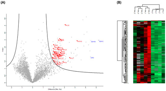 Statistical analysis of individuals with PC that had metastasized vs. that of healthy controls. (A) Volcano plots were generated based on two-sample Student’s t-tests in combination with a permutation-based correction for multiple hypothesis testing (FDR = 0.05) and an S0 = 1 filter. Proteins outside the solid curved line are deemed to be statistically significant. Ribosomal proteins (red square) are highlighted. (B) A clustering map was generated using Euclidean distance and the complete linkage clustering method with data from all significant proteins (metastasized and healthy control). Each row in the color heatmap indicates a single protein based on the Human UniProt accession number. Normalized protein abundance values (Z-scores) are indicated colorimetrically for each protein as the deviation from the mean by standard deviation units.