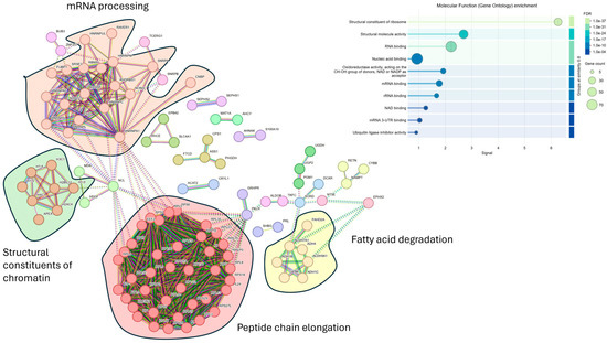 Despite the higher number of protein identifications using DIA-NN, subsequent analyses were all carried out using Spectronaut, as our laboratory already has a robust workflow using this search engine. We focused on data acquired using the Orbitrap Astral (depth) and carried out statistical analyses to compare plasma samples from individuals with different PC stages with those of healthy controls. We restricted the analysis to only including proteins that were detected and quantified in all 15 samples to ensure comparisons were only for proteins that were consistently identified in all samples, rather than the effect of differential enrichment, sample collection, or processes. However, given the small sample size, these findings should be considered preliminary. Proteins were deemed significantly changed based on a two-sample s0 modified Student’s t-test (s0 = 1) [28] in combination with a permutation-based correction for multiple hypothesis testing (FDR = 0.05). When comparing the plasma proteome of PC patients that had metastasis to that of control plasma, we observed a statistically significant difference in 146 proteins that were higher in individuals with PC who had metastasis (Figure 3A,B). Of these 146 proteins, only 9 were identified in the neat, digested control plasma samples. The top 10 highest changed proteins range from 29 to 77 times higher in metastasis patients compared to healthy controls. STRING MCL [29] clustering network of the 146 significantly changed proteins revealed four distinct clusters: peptide chain elongation, mRNA processing, structural constituents of chromatins, and fatty acid degradation (Figure 4). Gene ontology showed the most significant enrichment being the structural constituent of ribosomes. Comparing the plasma proteome of PC patients with the primary tumor to the healthy controls, 82 proteins were deemed significantly changed in abundance (Supplementary Figure S2). Of these 82 proteins, only 4 were identified in the neat digested control plasmas, and, similar to the metastasis patients, both ADH1C and ADH1B were also the most changed proteins at 28 and 20 times, respectively. STRING MCL of these 82 proteins showed clustering to mitochondrial ATP synthesis and apoptosis-induced DNA fragmentation (Supplementary Figure S3). The difference between the plasma proteome of metastasis and primary tumor is less profound, with 25 proteins deemed significantly changed based on two-sample Student’s t-test (p < 0.01) (Supplementary Figure S4). STRING MCL of these 25 proteins showed clustering to cytoplasmic translation and structural constituents of chromatins (Supplementary Figure S5).