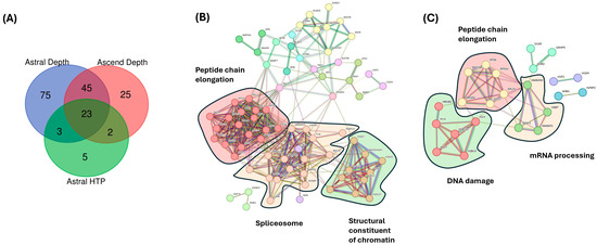 Analysis of significantly changed proteins using different MS acquisition methodologies. (A) Comparing the significantly changed proteins of individuals with PC that had metastasized vs. that of healthy controls across three acquisition methodologies (Astral Depth, Astral HTP, and Ascend). (B) Three main clusters were revealed from MCL enrichment for significant proteins from Orbitrap Ascend. PPI enrichment p-value = <1.0 × 10−16. (C) Three main clusters were revealed from MCL and insert, showing enrichment for significant proteins from Orbitrap Astral (HTP). PPI enrichment p-value = <1.9 × 10−11.
