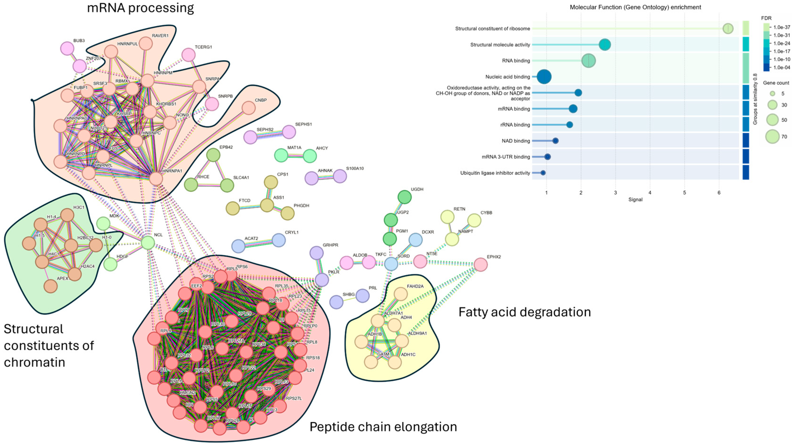 - Szklarczyk, D.; Kirsch, R.; Koutrouli, M.; Nastou, K.; Mehryary, F.; Hachilif, R.; Gable, A.L.; Fang, T.; Doncheva, N.T.; Pyysalo, S.; et al. The STRING database in 2023: Protein-protein association networks and functional enrichment analyses for any sequenced genome of interest. Nucleic Acids Res. 2023, 51, D638–D646. [Google Scholar] [CrossRef]