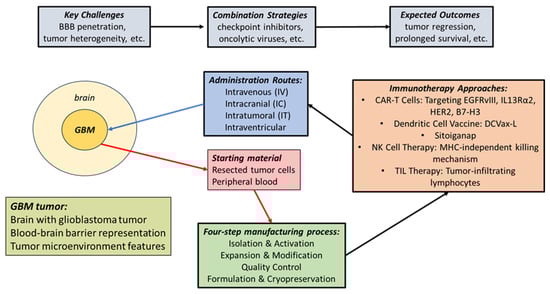 Increasingly, attention is generated for the applications in GBM of adoptive cell therapies (ACTs) such as chimeric antigen receptor (CAR) and receptor-engineered T cells, tumor-infiltrating lymphocytes (TILs), and NK-cell-based approaches that target specific tumor antigens. Although clinical efficacy remains limited, the current generation of multiantigen CARs can potentially overcome tumor antigen escape and immune suppression [].