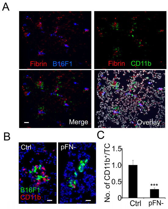 Our previous research showed that pFN promotes experimental lung metastasis in vivo and tumor cell invasion in clots in vitro [14]. Here, we tested if pFN mediates the homing of inflammatory cells to metastatic tumor cells arrested within blood clots in the lungs. To this end, B16F1 melanoma cells were injected into the tail vein of transgenic C57BL/6-Fn(fl/fl) Mx-Cre+ mice, which become pFN-deficient upon postnatal deletion of the FN gene in the liver. pFN-competent C57BL/6-Fn(fl/fl) Mx-Cre− littermates served as controls. One hour after the injection of fluorescent-labeled B16F1 cells, lung tissue was harvested, snap frozen in OCT, and stained for the myeloid cell marker CD11b as well as fibrin(ogen). Subsequent fluorescence microscopy analysis of lung tissue sections from pFN-competent C57BL/6-Fn(fl/fl) Mx-Cre− mice revealed extensive fibrin formation around tumor cells (Figure 1A). Moreover, fibrin-associated tumor cells were surrounded by large numbers of CD11b+ myeloid cells, which were in direct contact with the fibrin clot rather than with the tumor cells themselves. While recruitment of CD11b+ cells to metastatic tumor cells was extensive in pFN-competent C57BL/6-Fn(fl/fl) Mx-Cre− mice, we detected significantly less CD11b+ cells adjacent to tumor cells in lungs from pFN-deficient C57BL/6-Fn(fl/fl) Mx-Cre+ mice (Figure 1B,C). Together, these results suggest that pFN plays an important role in the initial recruitment of CD11b+ myeloid cells to metastatic tumor cells in mice in vivo.