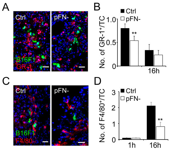 To further dissect the inflammatory reaction induced by circulating tumor cells, we performed immunohistochemistry of murine lung tissues harvested 1 and 16 h after intravenous tumor cell injection for the granulocyte marker Gr-1 and the macrophage marker F4/80. Subsequent fluorescence microscopy analysis revealed that the homing of Gr-1+ granulocytes to metastatic B16F1 tumor cells was significantly lower in the lungs of pFN-deficient C57BL/6-Fn(fl/fl) Mx-Cre+ mice 1 h after tumor cell injection compared to pFN-competent C57BL/6-Fn(fl/fl) Mx-Cre− mice (Figure 2A,B). At 16 h after tumor cell injection, the reduction in tumor cell-associated granulocytes in the lungs of pFN-deficient C57BL/6-Fn(fl/fl) Mx-Cre+ mice was still detectable but no longer significant. The association of F4/80+ macrophages with B16F1 tumor cells, on the other hand, was negligible in lungs from pFN-competent C57BL/6-Fn(fl/fl) Mx-Cre− as well as pFN-deficient C57BL/6-Fn(fl/fl) Mx-Cre+ mice harvested 1 h after tumor cell injection but increased considerably after 16 h (Figure 2C,D). Notably, the increase in tumor cell-associated macrophages after 16 h depended on the presence of pFN, as we detected significantly more macrophages in direct vicinity of tumor cells in the lung tissue of pFN-competent C57BL/6-Fn(fl/fl) Mx-Cre− mice than in the lungs of pFN-deficient C57BL/6-Fn(fl/fl) Mx-Cre+ mice. Therefore, our data indicate that pFN supports the initial recruitment of granulocytes as well as macrophages homing to tumor cells later on.