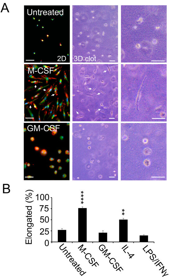 M2-polarized macrophages invade clotted plasma in vitro. (A) Representative fluorescence microscopy and phase contrast images of primary human macrophages from healthy donors after treatment for 8 days with vehicle control (untreated; top), M-CSF (middle), or GM-CSF (bottom). Fluorescence microscopy (left panel) shows merged images of macrophages cultured on cell culture slides stained for the macrophage marker CD68 (green), F-actin (red), and nuclei (blue). Phase contrast microscopy (middle panel, low magnification; right panel, high magnification) shows macrophages cultured in a 3D matrix of clotted plasma. White arrows denote filopodia (left panel) and elongation (left and middle panels) of M-CSF treated macrophages. Scale bar, 50 µm. (B) Phase contrast microscopy images of plasma clots were analyzed for percent elongated macrophages per optical field after treatment with vehicle control (untreated), M-CSF, GM-CSF, or following the addition of IL-4 or the combined addition of LPS and IFNγ for 24 h to the M-CSF treated cultures (n = 9). ** p < 0.01, **** p < 0.0001.