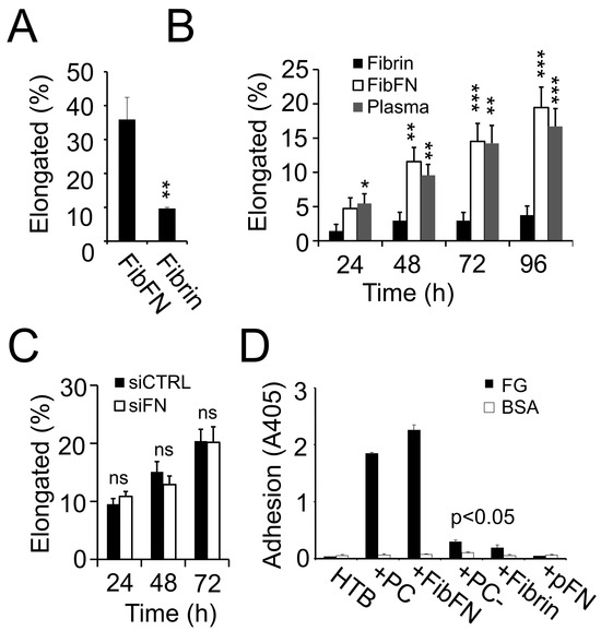 pFN is an integral component of clotted plasma as it becomes cross-linked to fibrin through the enzymatic activity of activated coagulation factor XIII [23]. To determine if the M-CSF-mediated shape change in M2 macrophages depends on pFN, we embedded monocytes isolated from the peripheral blood of healthy blood donors in a 3D matrix of fibrin–fibronectin, which we generated by mixing fibrinogen with pFN, thrombin, and calcium. A 7-day culture course in 3D fibrin–fibronectin in the presence of M-CSF resulted in the formation of elongated invasive macrophages in almost half of the embedded monocytes, while only a small fraction of monocytes elongated after embedding in a 3D matrix of pure fibrin without the addition of pFN (Figure 4A). Reproducing the data derived from primary human macrophages, we detected significantly more elongated THP-1 macrophages after embedding in 3D clotted plasma and fibrin–fibronectin than in 3D fibrin, which failed to support the shape change in macrophages completely (Figure 4B). The dependency of macrophages on pFN aligns with our findings that macrophages are unable to establish a fibronectin matrix on their own and that knocking down fibronectin with siRNA in THP-1 macrophages did not reverse cell elongation induced by fibrin–fibronectin (Figure 4C and Figure S2). The pro-invasive function of pFN depended on complex formation with fibrin because only solubilized fibrin–fibronectin complexes were able to stimulate the attachment of THP-1 cells to fibrinogen (Figure 4D). pFN, fibrin, or pFN-depleted plasma clot fragments, on the other hand, were ineffective. Together, these results indicate that fibrin–fibronectin complexes in blood clots stimulate adhesive interactions in macrophages that in turn support macrophage invasion and M2 polarization.