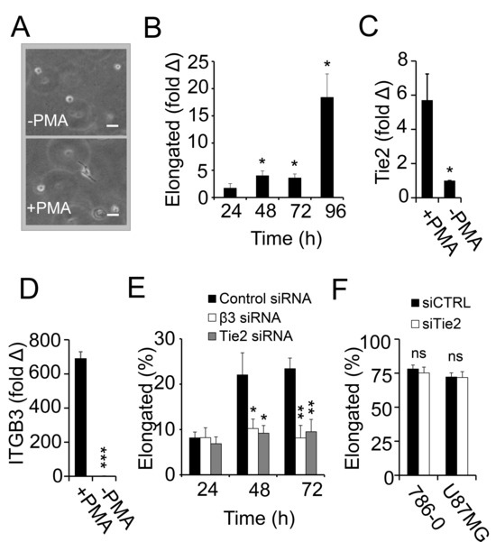 THP-1 cells were monitored for changes in gene expression 48 h after treatment with or without PMA. Total RNA was isolated from cells using the Qiagen RNeasy kit (Qiagen, Venlo, The Netherlands). RNA expression was measured using primers targeting TEK (Hs00945146_m1), ITGB3 (Hs01001469_m1), and TaqMan Gene Expression assay reagents (Thermo Fisher Scientific). RT-PCR was performed on an Applied Biosystems StepOnePlus™ Real-Time PCR System (Thermo Fisher Scientific). Values were normalized to TBP (Hs00427620_m1) as a reference gene.