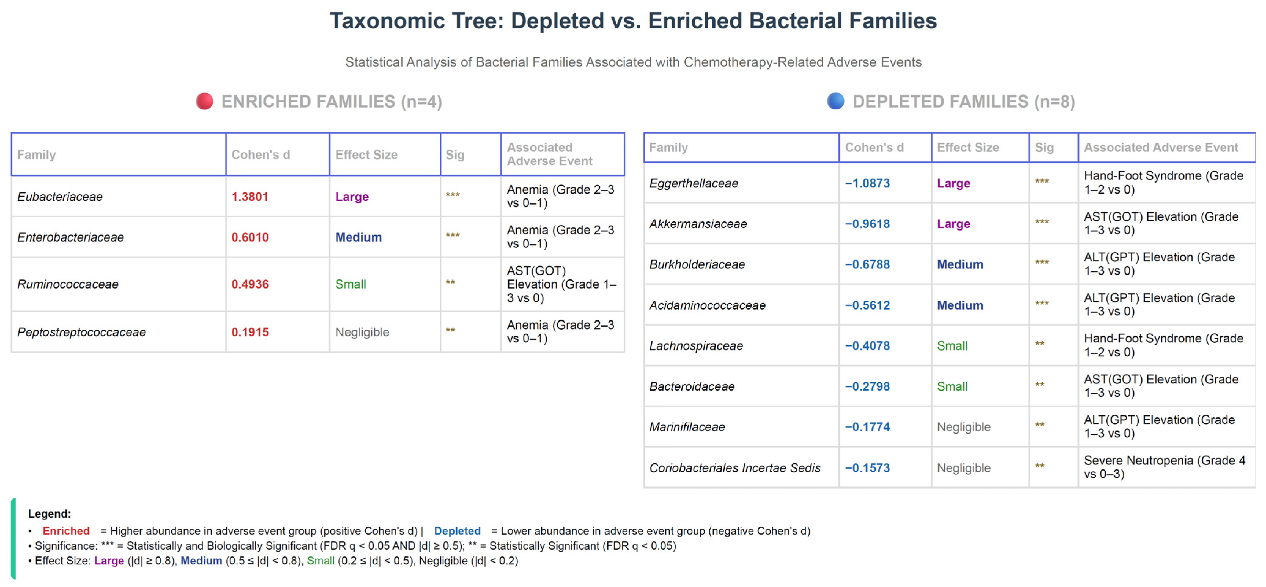 Heatmap analysis revealed distinct directional patterns of microbiota-adverse event associations spanning multiple taxonomic levels (Figure 2). Anemia (grades 2–3) demonstrated the strongest and most numerous associations, with large positive effect sizes observed for Eubacteriaceae family (d = 1.38) and multiple genera including Anaerofilum (d = 1.42), Eubacterium (d = 1.38), and Eubacterium brachy group (d = 1.07), as well as species Massiliomicrobiota timonensis (d = 1.40) and Eubacterium limosum (d = 1.38), indicating substantial enrichment of these taxa in anemic patients. The largest effect observed in our dataset was the enrichment of the Eubacteriaceae family in anemia (d = 1.38), accompanied by substantial enrichment of Anaerofilum (d = 1.42), Massiliomicrobiota timonensis (d = 1.40), and the pro-inflammatory family Enterobacteriaceae (d = 0.60) (Figure 3). Conversely, severe neutropenia (grade 4) exhibited a notable negative association with Eubacterium hallii group (d = −1.08), suggesting depletion of this genus in severely neutropenic patients. These distinct microbiome signatures associated with chemotherapy-induced hematological toxicities provide evidence for a bidirectional microbiome-hematopoiesis axis that may influence blood cell production during cancer treatment. Hepatic enzyme elevations showed consistent medium-effect associations, with AST elevation linked to Coriobacteriaceae family and Collinsella genus (both d = 0.66), while ALT elevation associated with Faecalibacterium (d = 0.70) and Streptococcus (d = 0.72). Gastrointestinal adverse events demonstrated moderate positive associations, including nausea with multiple genera (Gemella, Rothia, Veillonella, Acidaminococcus; all d = 0.70) and oral mucositis with Lachnospira (d = 0.69). Fatigue exhibited mixed directionality, with positive associations for Agathobacter (d = 0.47) and Dialister (d = 0.52), but a negative association with Parasutterella (d = −0.53). The majority of significant associations were positive (enrichment in adverse event groups), with only three taxa showing negative associations, suggesting that chemotherapy-related adverse events are predominantly characterized by expansion rather than depletion of specific microbial taxa.