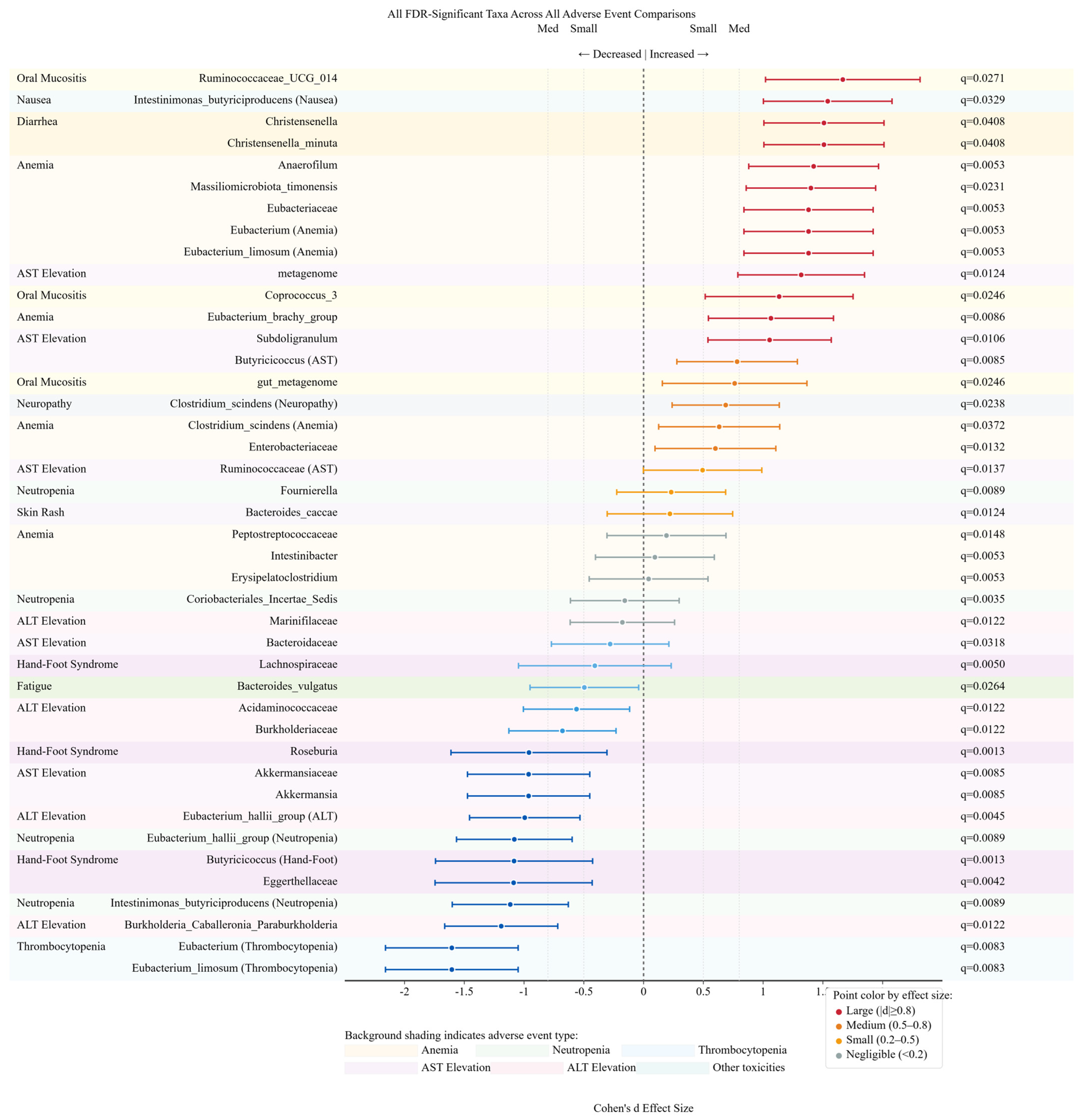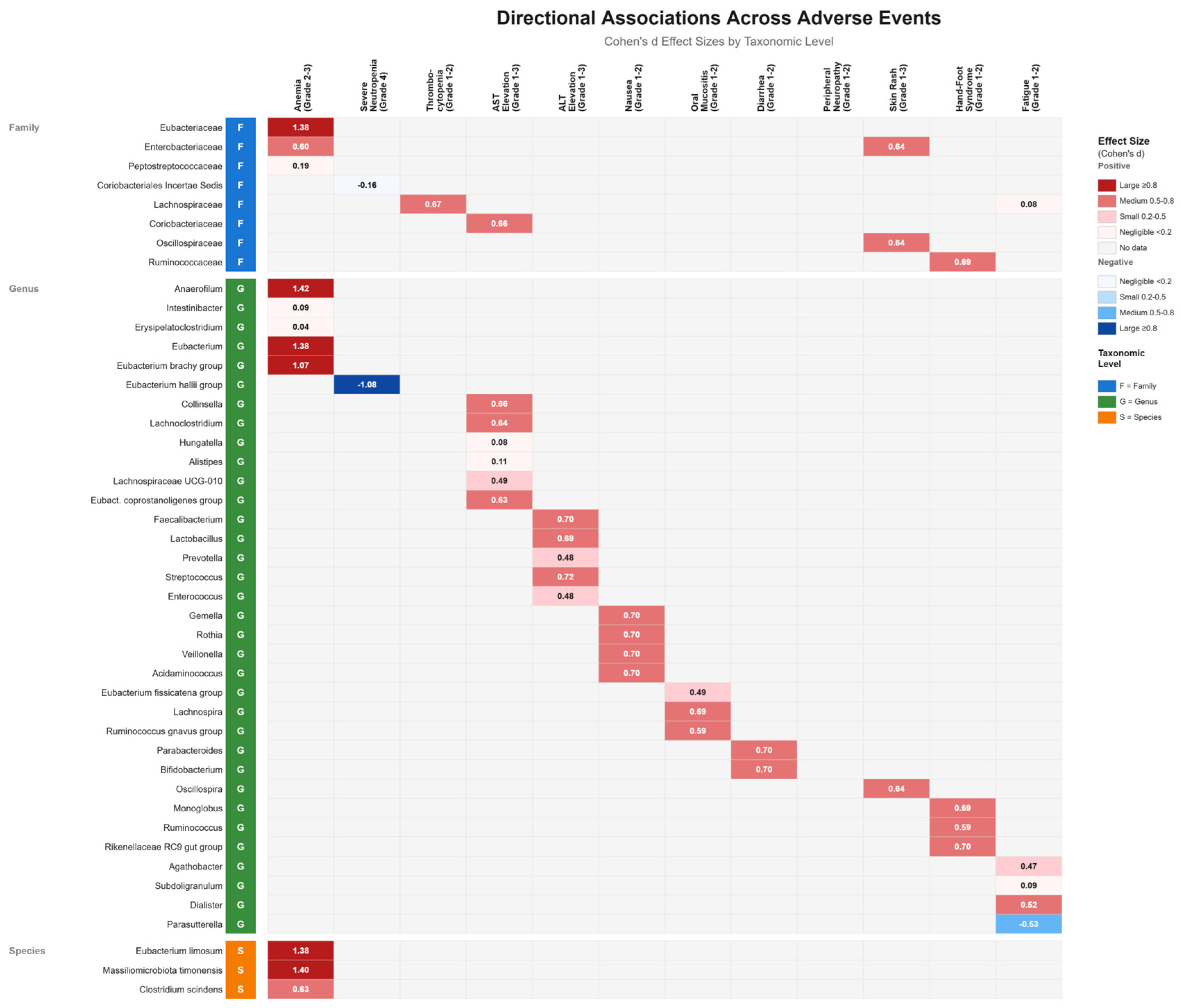 Forest plots visualized effect sizes and 95% CIs for FDR-significant taxa, with positive Cohen’s d indicating enrichment in adverse event groups. A comprehensive heatmap displayed Cohen’s d values across 46 taxa (rows) and 12 adverse events (columns), organized by taxonomic level (family, genus, species). Positive associations were shown in red gradients, negative in blue, with color intensity reflecting effect magnitude. Taxa were color-coded by level (blue: family; green: genus; orange: species). Non-significant cells appeared in gray.