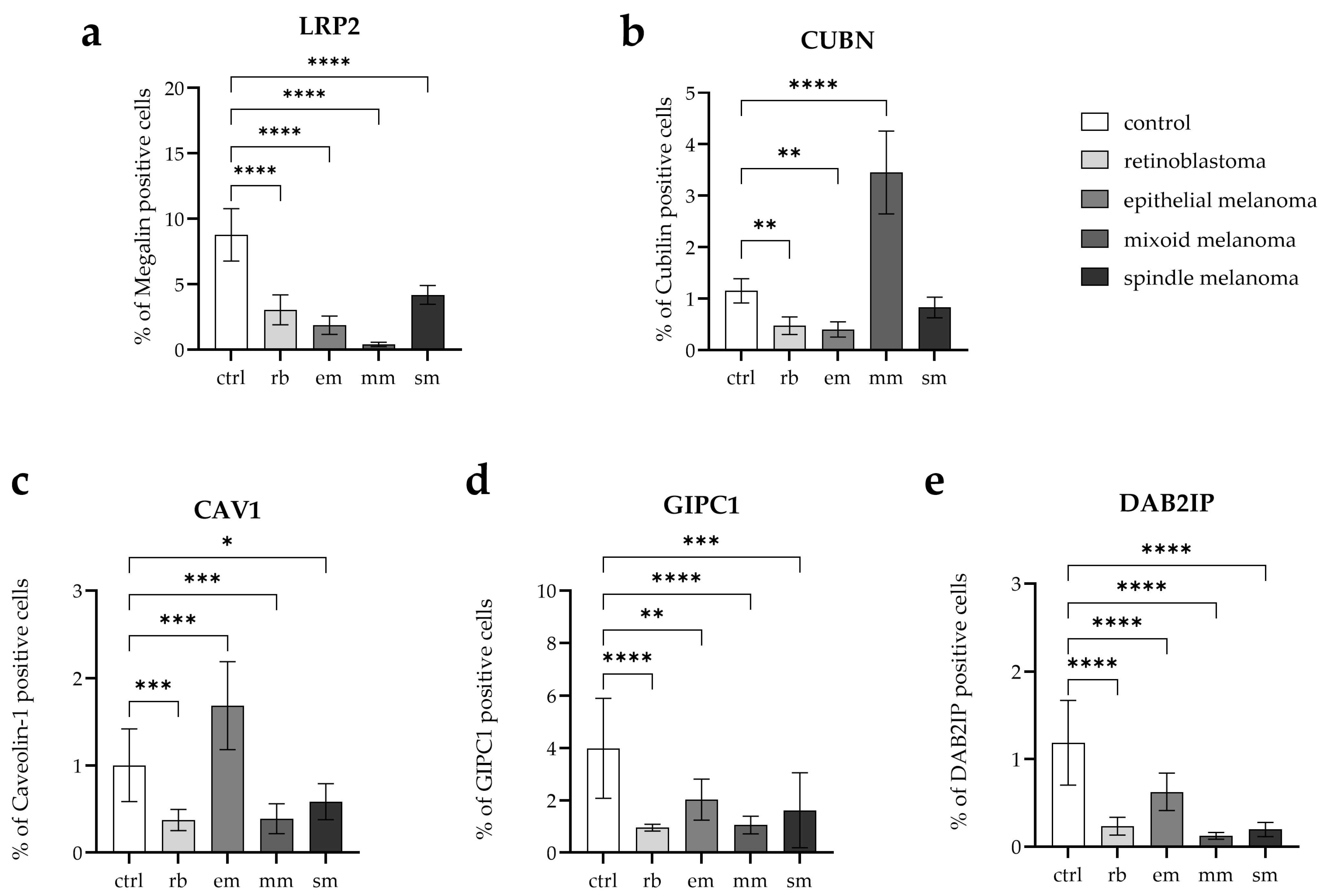 45]. For comparative analysis, the percentage of positively stained cells for Megalin, Cubilin, Caveolin-1, GIPC1, and DAB2IP was analyzed across different groups (control, RB, epithelial melanoma, mixoid melanoma, and spindle melanoma) using one-way analysis of variance (ANOVA) followed by Tukey’s post hoc test to assess pairwise differences [
