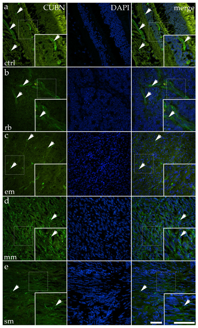 13]. Our data parallel this observation, as CUBN downregulation in RB and epithelioid melanoma may similarly reflect dedifferentiation and a more aggressive phenotype. Supporting this, Niinivirta et al. demonstrated that CUBN positivity predicted better progression-free and overall survival in metastatic RCC patients treated with sunitinib or sorafenib [