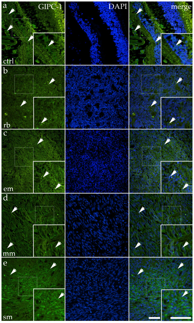 Taken together, these findings indicate that GIPC1 is downregulated in RB, spindle, and myxoid melanoma, while epithelioid melanoma retains control-like expression. Unlike in other cancers, where GIPC1 overexpression promotes aggressiveness, ocular tumors exhibit a distinct pattern, suggesting that GIPC1 loss may be linked to dedifferentiation but not necessarily to progression.