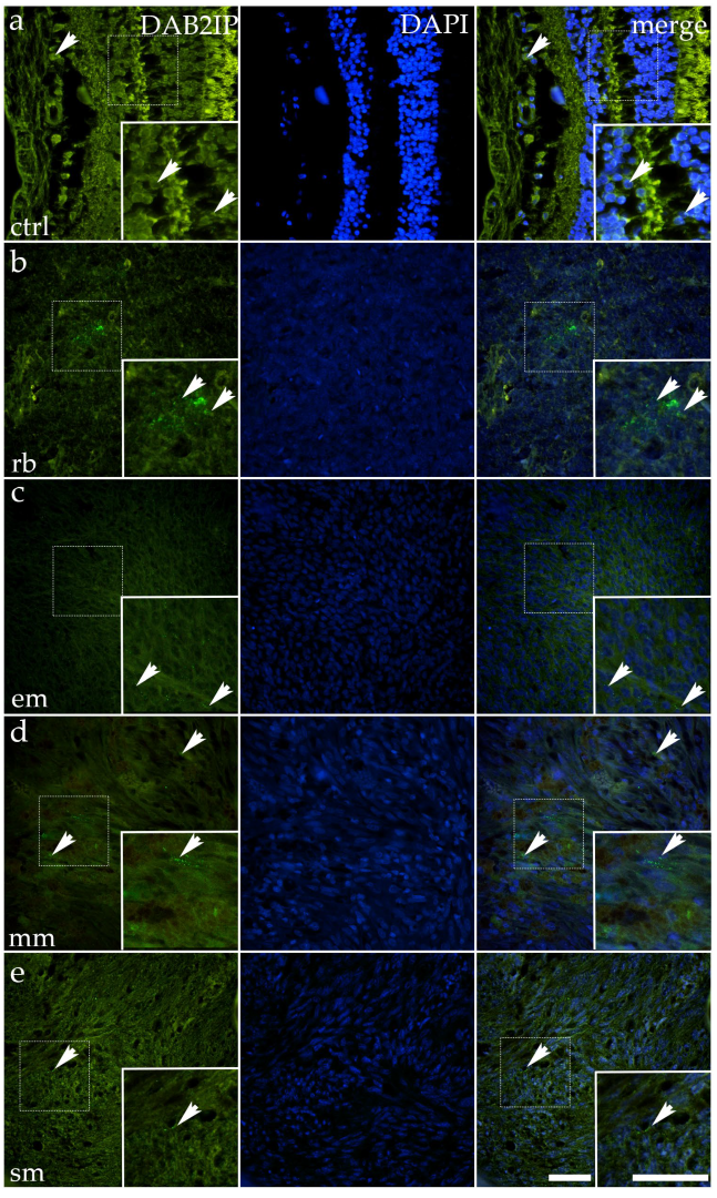 Taken together, DAB2IP was significantly reduced in RB, spindle, and myxoid melanoma, but not in epithelioid melanoma, suggesting that DAB2IP loss is more pronounced in more dedifferentiated histotypes. This pattern aligns with DAB2IP’s tumor-suppressor role, where its repression (epigenetic/microRNA) unleashes ERK/AKT/NF-κB signaling, proliferation, EMT, and resistance to apoptosis, while preserved expression in epithelioid melanoma suggests a reliance on alternative oncogenic programs.