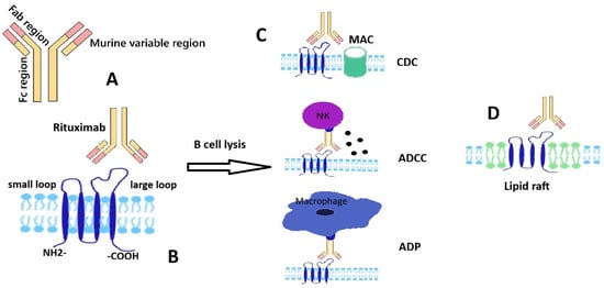 Schematic representation of rituximab and CD20 structures and interaction; main B cell lysis mechanisms. (A) A schematic structure of monoclonal antibody-rituximab. (B) A schematic structure of transmembrane protein CD20 with two extracellular domains (rituximab epitope located on the large loop). (C) Rituximab-induced B cell lysis mechanisms: complement dependent cytotoxicity (CDC) by classical complement cascade leading to formation of membrane attack complex (MAC), antibody dependent cell-mediated toxicity (ADCC) by recruiting natural killer (NK) cells, antibody-dependent phagocytosis by macrophages; (D) rituximab-induced redistribution of CD20 to a membrane lipid raft.