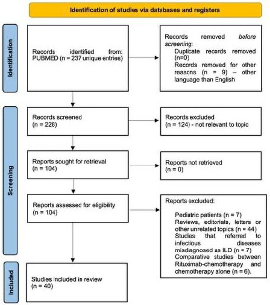 We conducted a systematic search of the PubMed/MEDLINE database using the keywords “Rituximab induced interstitial lung disease”, with no time restrictions, up to August 2025. The primary objective was to identify and analyze published material relevant to the development of interstitial lung diseases following rituximab administration. The initial search identified 237 articles; all abstracts were screened to assess their relevance to the topic using the following inclusion criteria: cohort, case series or case presentation of R-ILD occurring within adult populations. When abstracts were considered adequate by at least two reviewers, the full text article was retrieved, explored in detail and included in the final analysis. The overall selection process is illustrated in the PRISMA flow diagram (Figure 2 and Supplementary File S1). A primary data table was generated containing the following parameters in a free form format: author, title, publishing year, type of article, number of patients (with R-ILD and total number of patients for cohorts), disease (specific entity and malignant/non-malignant category), therapy (rituximab-containing regimen, other concomitant medication), time to ILD onset (number of therapy cycles, time from last infusion of rituximab), type of ILD (imagistics, pathology), functional impact, treatment, and outcome. Case series were split into individual cases whenever there was enough information to do so; the table containing individual cases was used to analyze gender ratios and time to onset of R-ILD. Cohorts containing rituximab-treated patients were pooled together to estimate global incidence of R-ILD. Some data such as computed tomography, treatment or outcome was parsed but no attempt to standardize data was made given the high variability of expression and the risk to introduce bias.