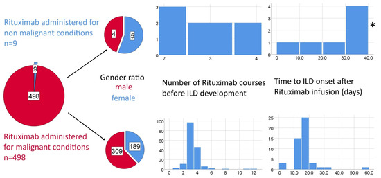 Potential differences between Rituximab-induced ILD associated with malignant and non-malignant conditions in terms of gender ratios expressed as pie charts and time to ILD (number of therapeutic cycles and time from last rituximab perfusion) expressed as histograms. * one outlier value of 270 days was excluded from the histogram due to scaling issues.
