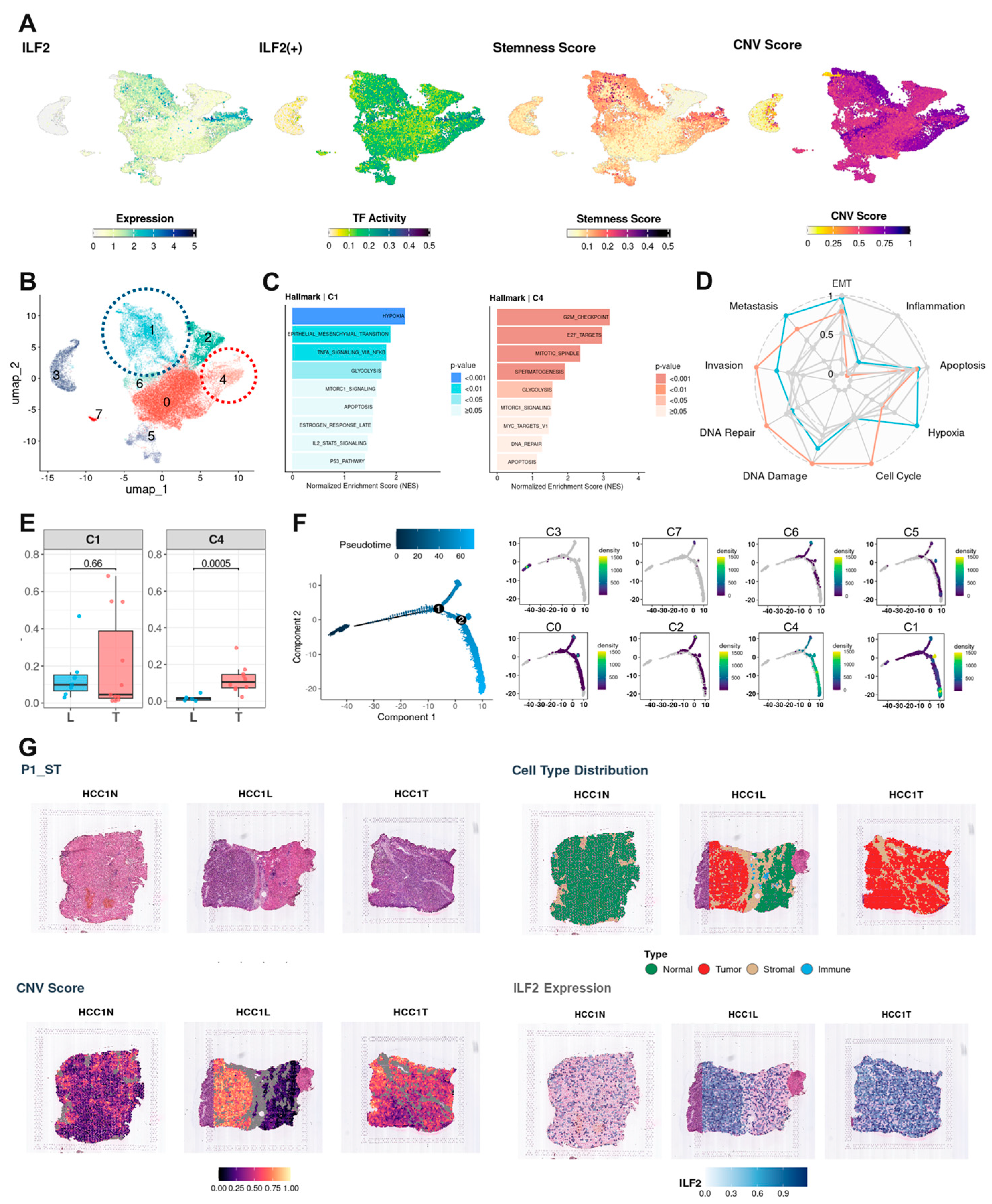 - C1 (invasive/metabolic/inflammatory): SPP1, TM4SF1, LGALS3, AGR2, G6PD, PKM, SLC2A1, NQO1, VEGFA, CAV1; enriched for hypoxia, EMT, TNF-α via NF-κB, glycolysis.