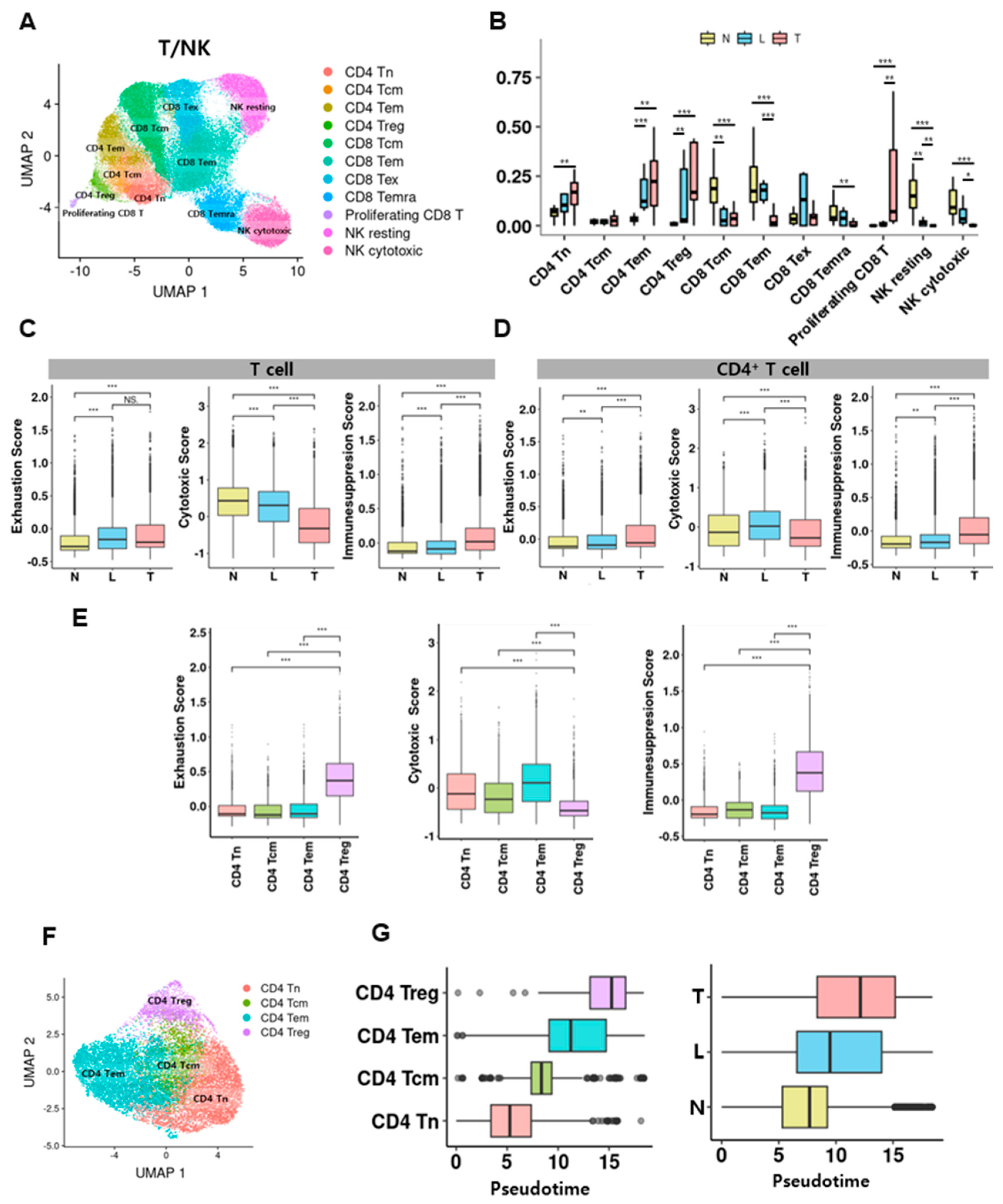 3.4. Regional Distribution of T/NK Cell Subtypes and Functional Reprogramming of CD4+ T Cells in the Tumor Microenvironment