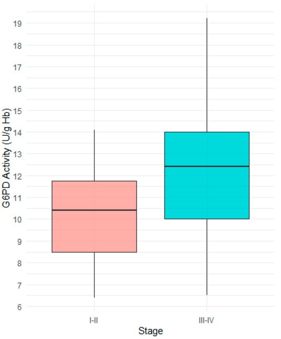 This cross-sectional study included a total of 64 patients. In this study, gastric cancer was first divided into early-stage (Stage I–II) and advanced-stage (Stage III–IV). Variables were compared between the early-stage and advanced-stage gastric cancer groups, and the results are presented in Table 1. In the early-stage gastric cancer group, 29.6% of patients were male, whereas in the advanced-stage group, 59.5% were male. A chi-square test revealed a statistically significant difference in the distribution of gender to cancer stage. No significant difference in age was observed between the two groups classified by cancer stage, as determined by Mann–Whitney U test. The median G6PD activity was significantly higher in the advanced-stage group (12.4 U/g Hb) compared to the early-stage group (10.4 U/g Hb). Figure 1 shows the distribution of G6PD activity according to cancer stage, demonstrating a significantly higher median value in the advanced-stage gastric cancer compared to the early-stage gastric cancer.