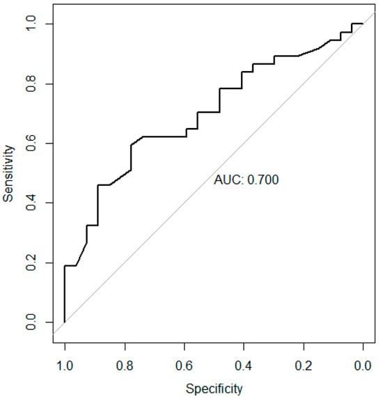 As shown in Figure 2, diagnostic performance was assessed using a receiving operating characteristic (ROC) curve, and the area under the curve (AUC) was calculated. The AUC was 0.70 (95% CI, 0.57–0.83). Youden’s index was applied to identify the optimal cutoff point of G6PD activity that best discriminates between early-stage and advanced-stage gastric cancer. Youden’s index, defined as sensitivity + specificity − 1, indicates the cutoff point with the best balance between sensitivity and specificity [23]. The optimal cutoff point calculated in this study was 12.05 U/g Hb.