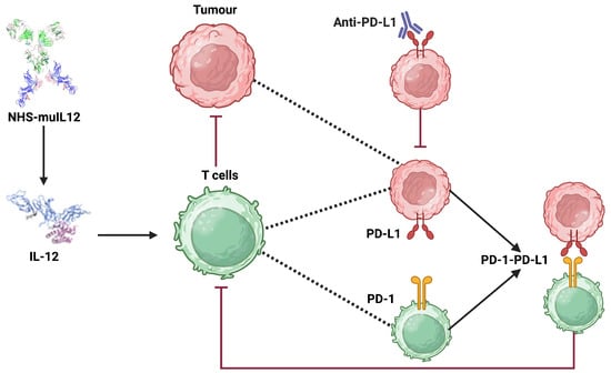 Schematic illustration of the synergistic antitumor mechanisms of NHS-muIL12 and anti-PD-L1 (Avelumab) checkpoint blockade within the tumor microenvironment. The diagram shows how NHS-muIL12 delivers IL-12 to promote T-cell activation, while anti-PD-L1 antibody therapy overcomes tumor-induced immune suppression by disrupting the PD-1/PD-L1 axis. Created in BioRender https://biorender.com/4yxwllp (accessed on 23 September 2025).