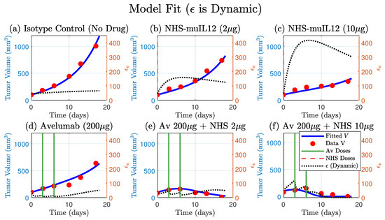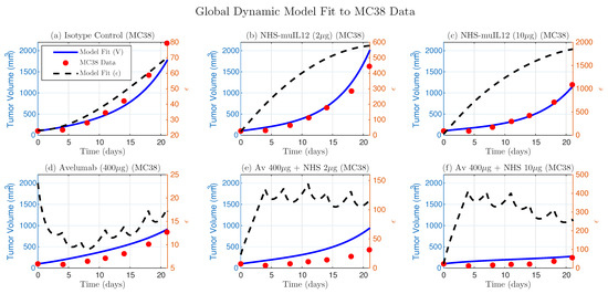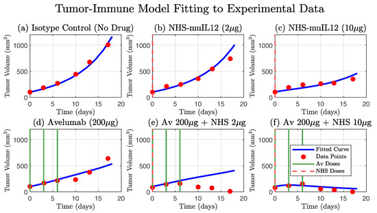 In their simulation studies, they rigorously estimated parameter values from the literature and the remaining parameters were estimated by fitting the model to cancer treatment experiments that were conducted on mice in [14]. These experiments included the following: (a) Isotype control (no drug); (b) NHS-muIL12 (2 g); (c) NHS-muIL12 (10 g); (d) Avelumab (200 g); (e) Avelumab (200 g) and NHS-muIL12 (2 g); (f) Avelumab (200 g) and NHS-muIL12 (10 g). BALB/c mice bearing orthotopic EMT-6 tumors (100 ) were treated with Avelumab on days 0, 3, and 6, while NHS-muIL12 was administered as a single dose on day 0. Model fitting was systematic in the sense that they sequentially fit the model to data using more complexity as more treatments were introduced. Specifically, they used the no-drug case to estimate the proliferation rate of the tumor cells (r) and the kill rate of tumor cells by T-cells (). From there, they estimated by fitting the model to the NHS-muIL12 (2 g) data and similarly they estimated using the Avelumab (200 g) data.