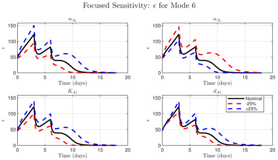 We therefore performed a focused time-course analysis on Mode 6, varying the parameters for production (), blockade (), Avelumab binding (), and Avelumab clearance (). The results, shown in Figure 5, demonstrate that while the model is sensitive to these key mechanistic parameters, the qualitative outcome of tumor elimination is not compromised by a ±25% variation. This analysis provides confidence that our model structure is sound and that its core conclusions, namely the necessity of combination therapy to simultaneously stimulate T-cells and block the resulting adaptive resistance, are robust and not an artifact of specific literature-derived parameter choices.