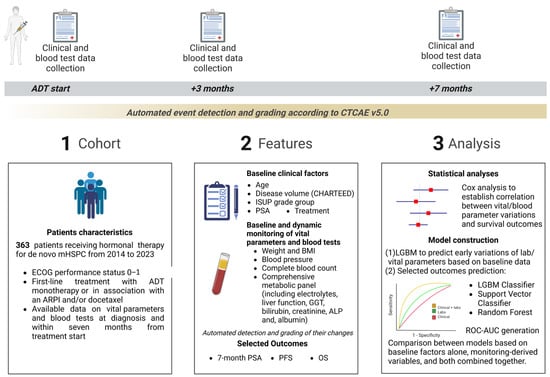 To identify factors potentially influencing survival outcomes in Cox analyses and ML models and to detail the clinical changes happening within the early phases of systemic treatment for mHSPC, we collected a comprehensive set of demographics, clinical, and laboratory parameters, as detailed in Method S3. Patient clinical and laboratory data were collected from treatment initiation to seven months after ADT start.