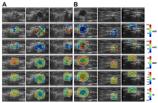 Figure 2 shows representative B-mode and QUS spectral parametric images of malignant breast tumors with low-risk ODXRS (A, left three columns) and intermediate-to-high-risk ODXRS (B, right three columns). Although visual discrimination between low and intermediate-to-high risk groups is not immediately perceptible from the images, further quantitative analysis demonstrates discrimination, especially for the features derived from the wavelet-filtered version of the original QUS maps.