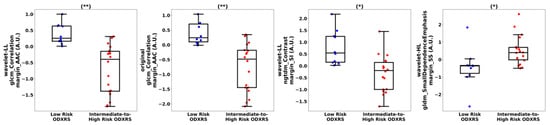 Accounting for multiple hypothesis tests with a Bonferroni correction, the wavelet-LL GLCM correlation margin AAC and original GLCM correlation margin AAC demonstrated statistically significant differences between intermediate-to-high-risk ODXRS and low-risk ODXRS (p-values < 0.001). Although univariate statistical analysis indicated that two radiomic features are statistically significantly different between intermediate-to-high-risk ODXRS and low-risk ODXRS, the combination of several discriminating features can still lead to a generalizable multivariate model.