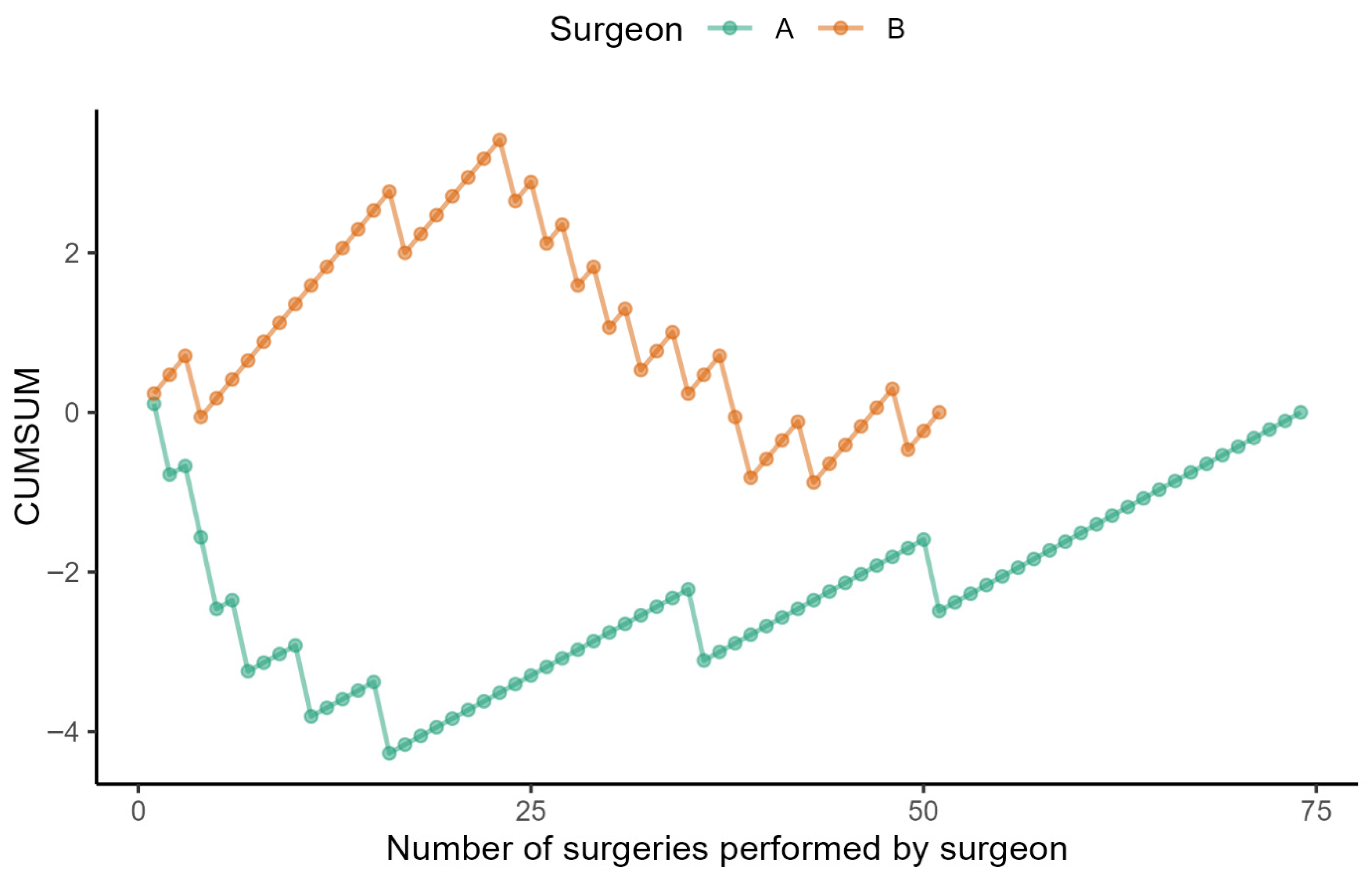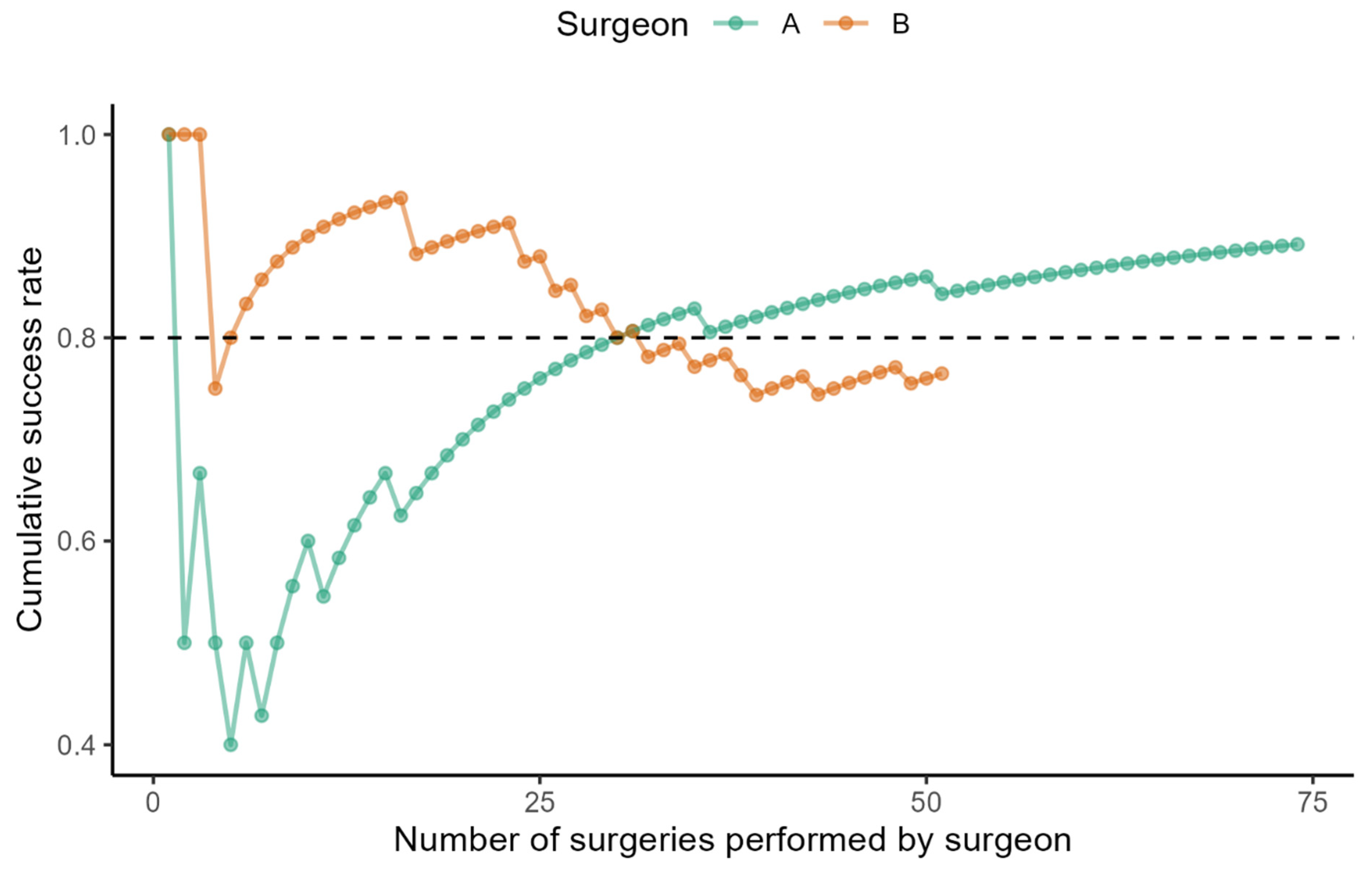 Surgeon A achieved an 80% success rate at the 30th. He gained an 89% success rate after performing the 74th surgery (the last one evaluated). Surgeon B demonstrated a high success rate from the beginning, reaching 89%. Subsequently, his performance curve slightly declined. In the most recent observed operations (a total of 51 surgeries), the negative trend has been reversed, and his success rate has reached 75%.